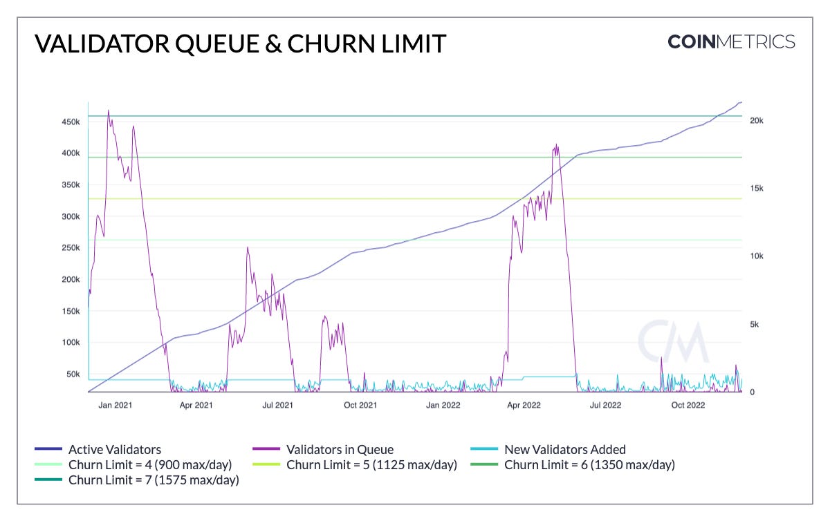 - Over two months have passed since the Merge and demand for staking on Ethereum has remained robust. There are currently around 481k active validators with 15.4m ETH staked. After the network surpassed 458k active validators in early November, a constant known as the churn limit was raised to seven, increasing the rate that limits daily new validators from 1,350 to 1,575/day.