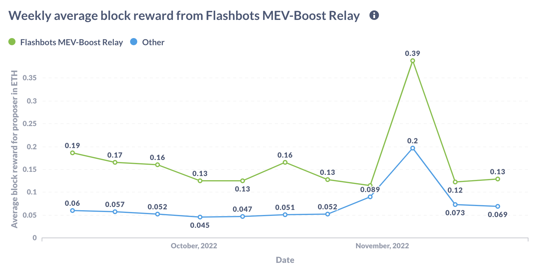 - The weekly average block reward chart compares the revenue per block from Flashbots MEV-Boost Relay and other blocks. "Other" includes blocks proposed from other relays or regular mempool blocks. Flashbots’ relay has consistently provided a higher revenue to proposers since the Merge.