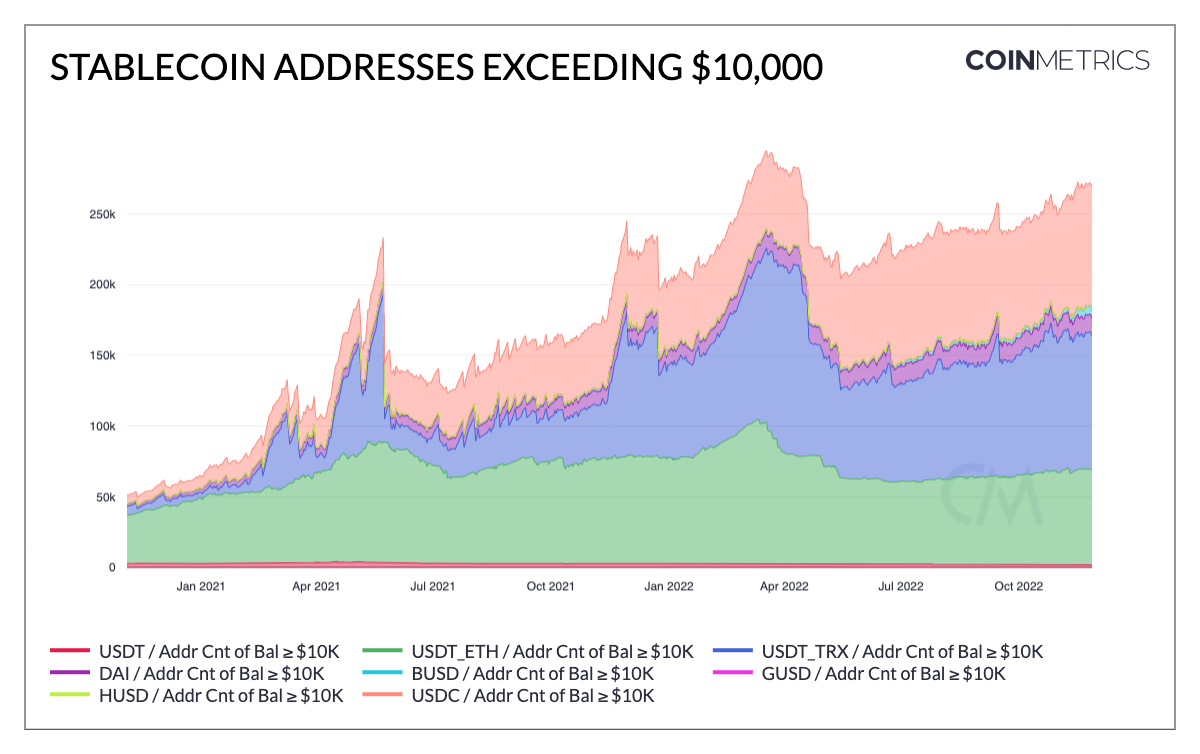 - Adoption is rising as users withdraw funds from exchanges to reduce their risk. The number of addresses holding an excess of $10k denominated in various stablecoins has increased in the last few months. USDC has seen a significant increase since the beginning of November, from 76k to 86k addresses.