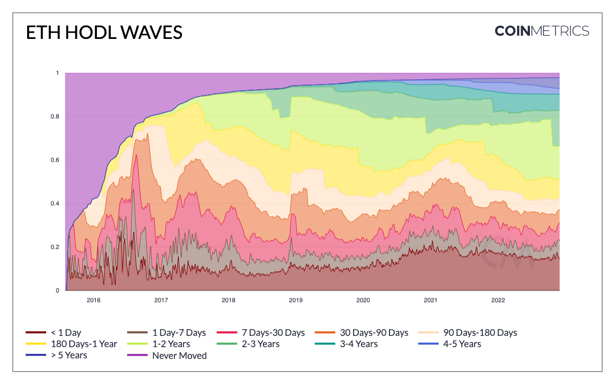 - Two years have passed since the launch of the Beacon Chain, and with it 33% of ETH supply has now been inactive for over 2 years. This is apparent in ETH’s active supply bands (aka HODL Waves), which illustrate the “age” of unmoved ETH.