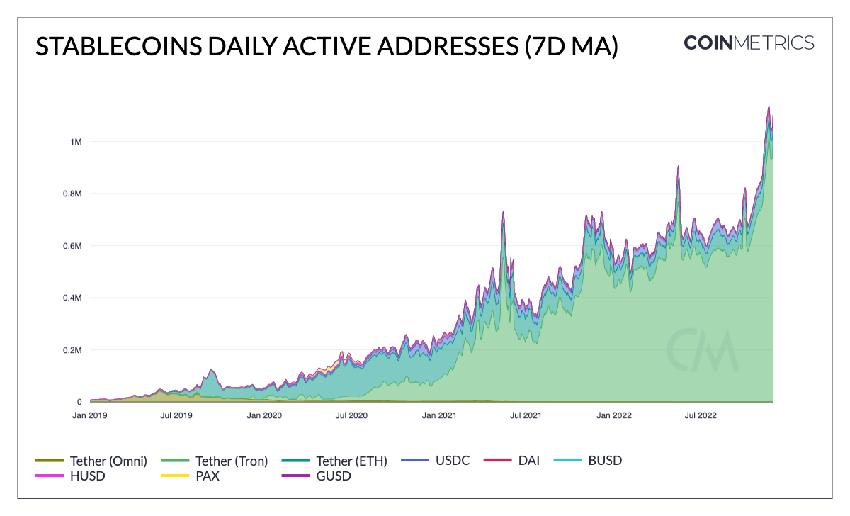 - Active addresses are also breaching new highs, crossing 1m per day. Much of this increase is attributable to Tether on Tron, likely due to users’ sensitivity to fees. However, stablecoins on Ethereum have also seen higher adoption: USDC active addresses hit an all-time high of 91k on November 9.