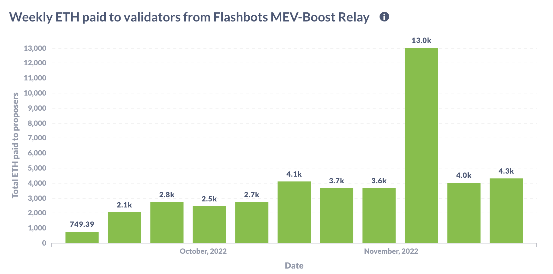 - The Flashbots MEV-Boost transparency dashboard is a public dashboard showing metrics of the Flashbots MEV-Boost relay since the Ethereum Merge. It is a part of Flashbots' efforts to provide transparency to the MEV ecosystem. The dashboard shows the Ethereum mainnet data post-Merge from block #15537940, which is when the first MEV-Boost block was included on-chain. The weekly ETH paid to validators reached all-time-high post-Merge in the week of November 7, reaching 13k ETH.