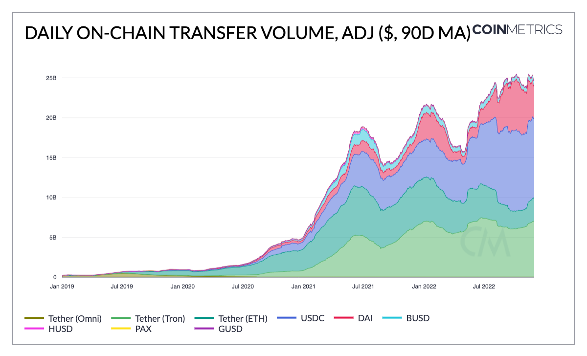 - Stablecoin use is climbing ever higher through the bear market. Stablecoins’ daily on-chain transfer volume is near an all-time high of $25b per day (90-day moving average). About $20b of this is sourced from USDC (on Ethereum) and Tether (Ethereum and Tron) transfers.