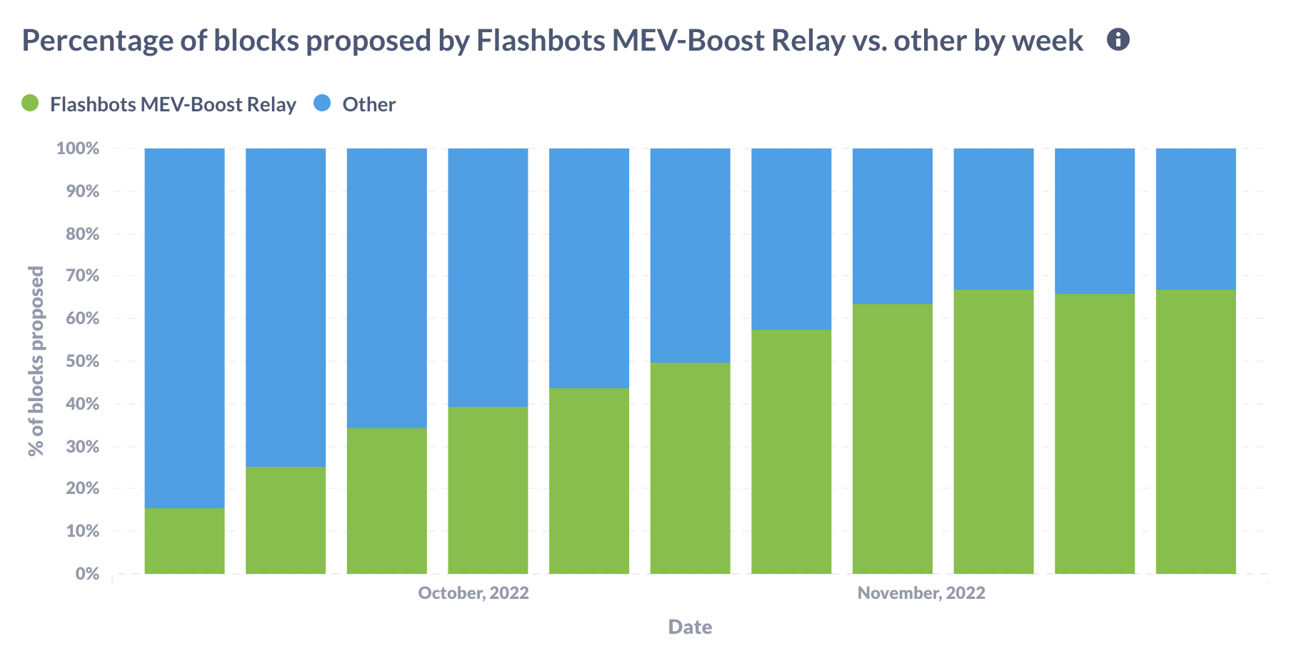 - This chart shows the percentage of blocks proposed by Flashbots MEV-Boost Relay and others within a given week. The first 8 weeks since the Merge show a steady increase in the percentage of blocks proposed by MEV-Boost Relay. The pace is slowing down after reaching 60% in the first week of November.