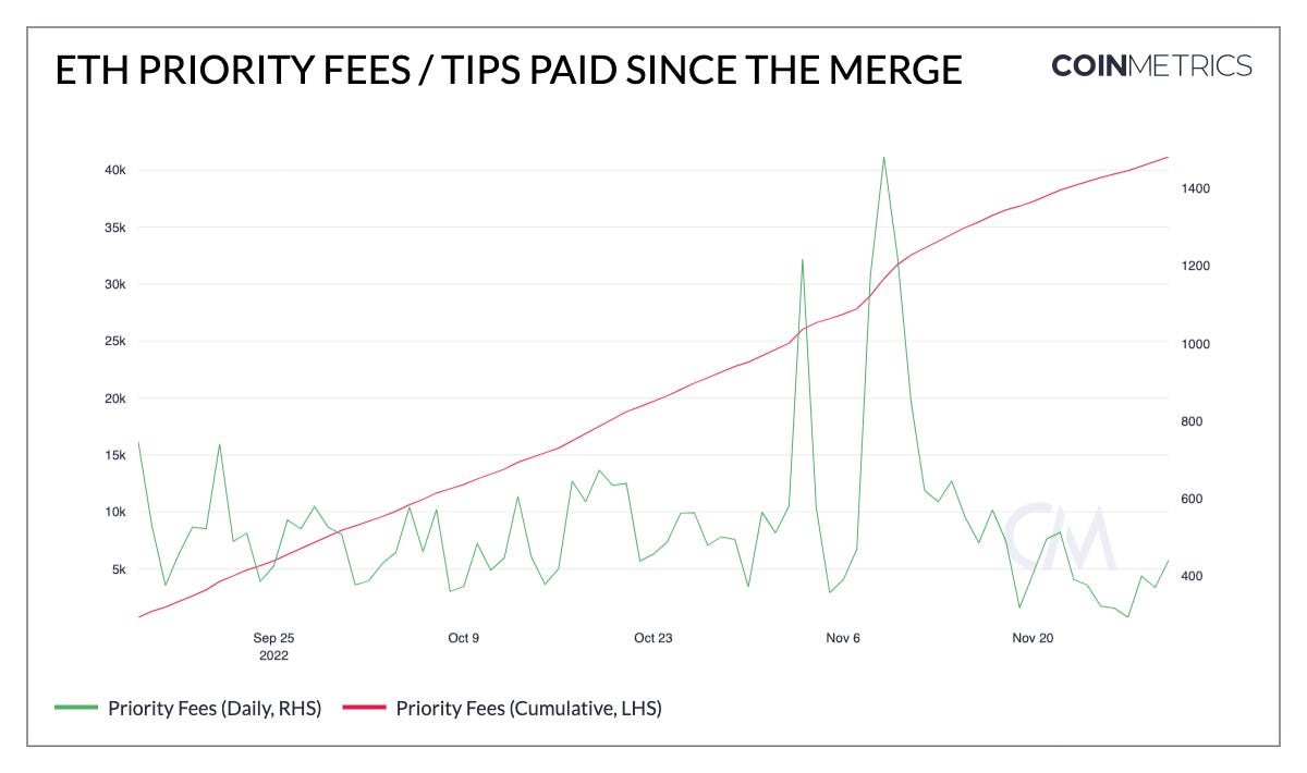 - Although staking rewards are locked on the Beacon Chain until the activation of withdrawals (likely with the Shanghai hard fork), validators now receive priority fees (i.e., tips) on the execution layer. Since the Merge, validators have received a total of 40k ETH (~$54m) in tips.