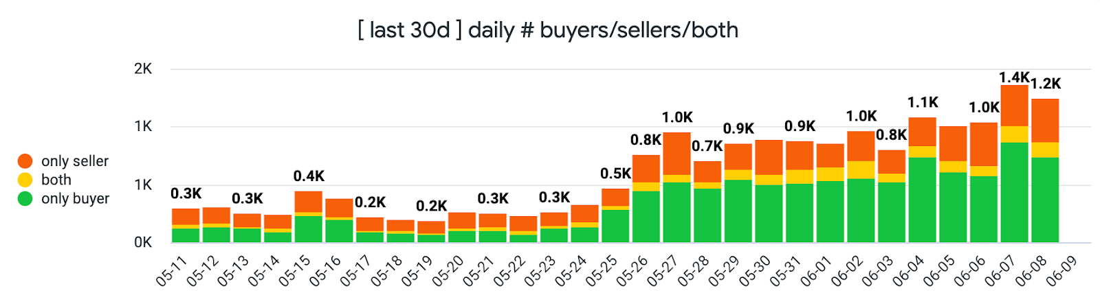- Aptos has seen a notable rise in NFT projects and mints since its establishment. Leading projects such as Aptos Monkeys and Aptomingos have been successful in generating substantial volume (475k and 178k APT respectively). And while the last few months have seen a downturn in NFT activity across all chains, June has brought about a resurgence in Aptos NFT activity. There's been close to a four-fold increase in active wallets on Aptos NFT marketplaces, underpinned by a significant uptick in buyer activity.