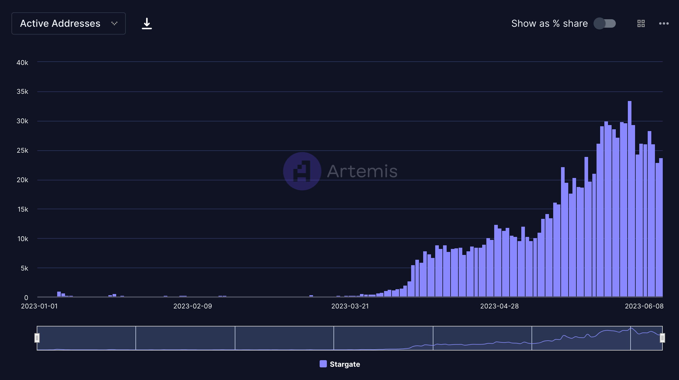 - Avalanche active addresses have seen meaningful growth YTD 2023 driven by the Stargate application, which has seen ~30k daily active users over the past month. Stargate is a cross-chain bridge allowing accounts to bridge tokens across blockchains such as Ethereum, Avalanche, BNB Chain, Fantom, Arbitrum and Optimism. Stargate utilizes LayerZero's technology to provide an omnichain experience for its users.