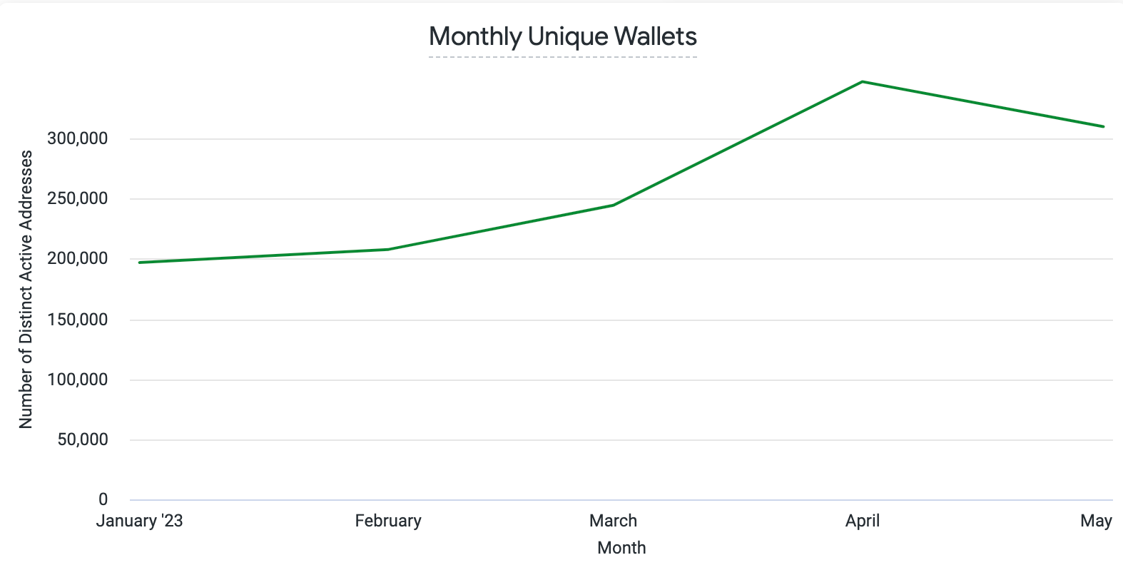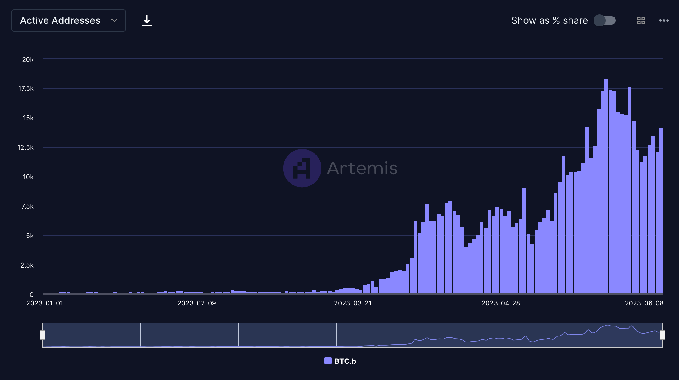 - BTC.b, the wrapped bitcoin contract on Avalanche also saw meaningful growth over the course of 2023. BTC.b started the year with ~78 active addresses on Jan 1, 2023, and since grown to ~18.3k active addresses interacting with the contract during its peak day on May 25, 2023.