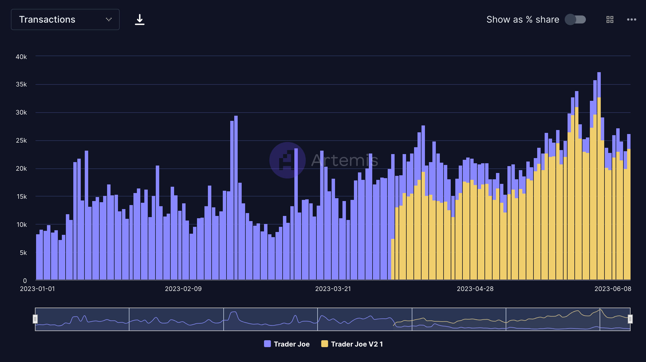 - Trader Joe continues to be the powerhouse DEX on Avalanche, averaging ~15k daily active addresses over the past month. The application also saw YTD highs transactions during the month of May average ~28k daily transactions over the month.