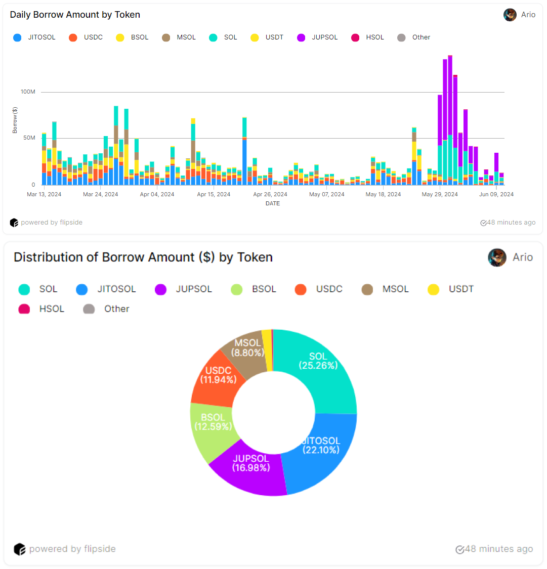 - $SOL is the most popular choice for borrowing among users, making up a significant portion, 25.2%, of the total loan volume. JitoSOL and JupSOL are close behind, capturing 22.1% and 17% of the market share, respectively. JupSOL's achievement is particularly impressive considering it reached this volume in just 10 days.
