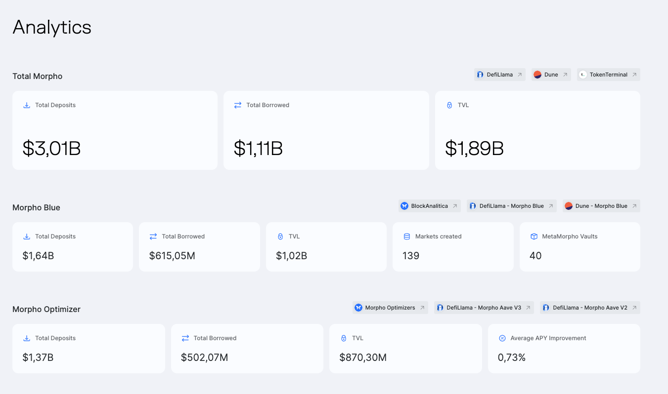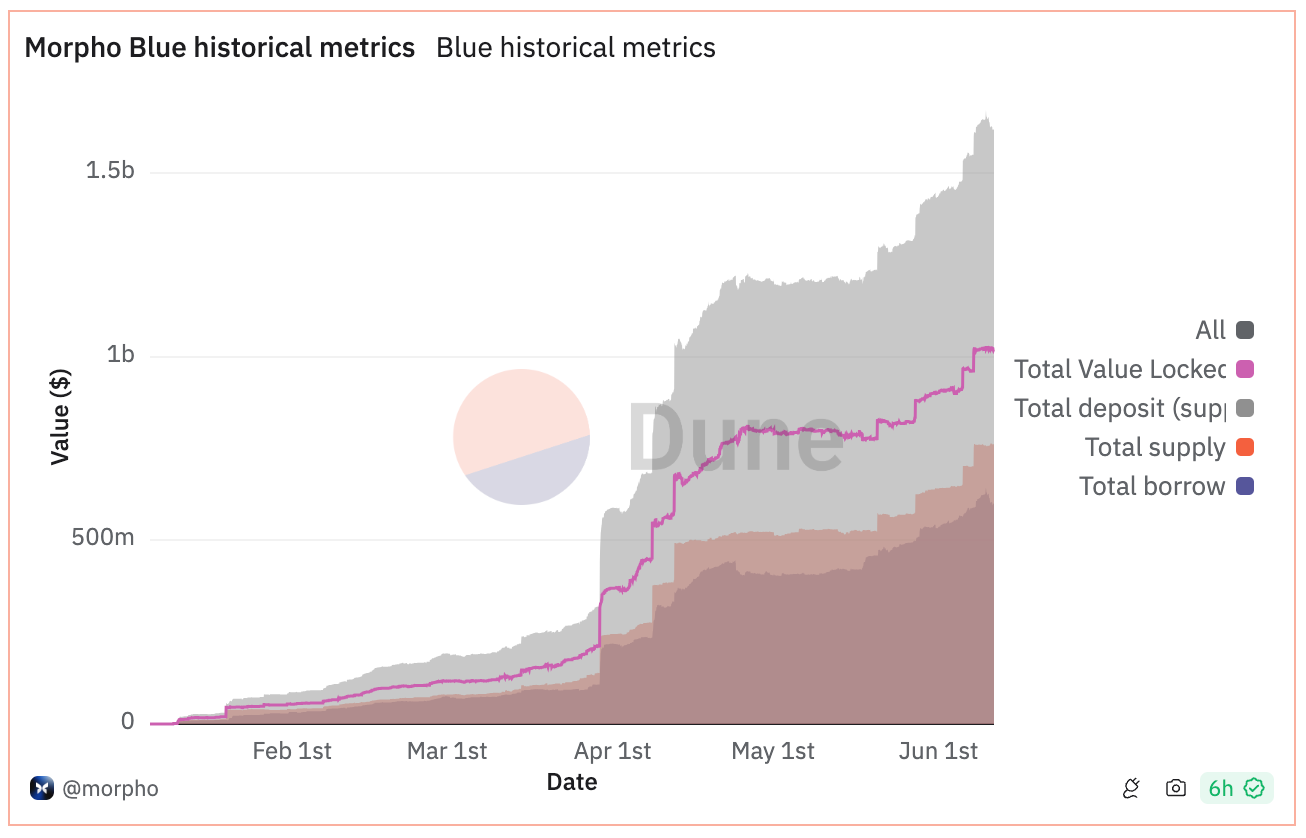 - Boosted by its partnership with Spark, who is currently deploying $500M DAI on markets backed by Ethena's token USDe and sUSDe, Morpho Blue flipped Morpho Optimizers in total deposit, total value locked and total borrow.