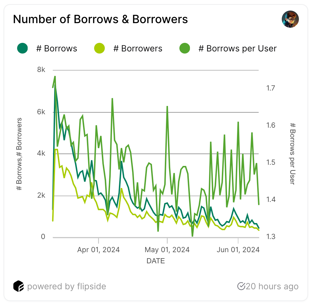 Over the last 90 days, Kamino has seen a significant presence of 50.6 thousand active borrowers. However, there's been a noticeable decline in both borrower numbers and loan uptake. For instance, daily active users have plummeted from approximately 4,000 to just 500.