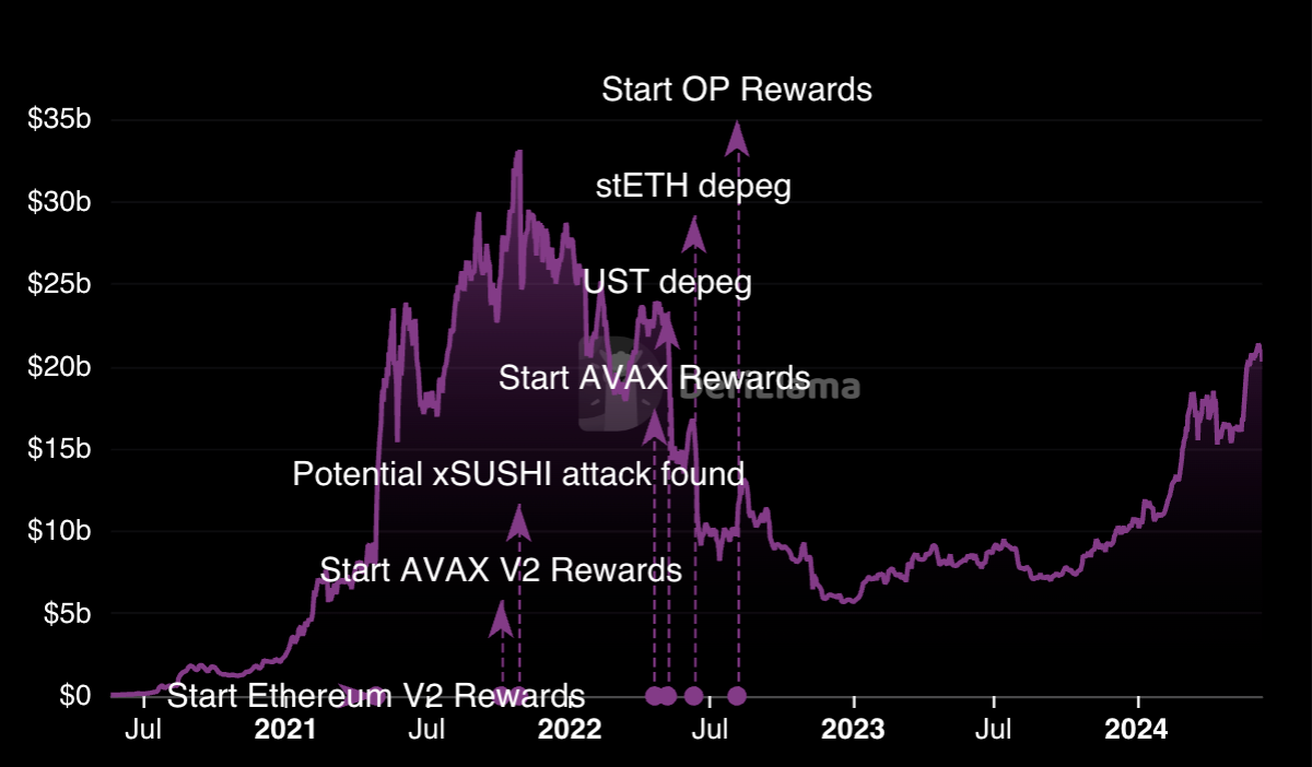 - Aave's TVL started trending upward in late 2023, and 2024 has been a remarkable year for the protocol. TVL has surged from approximately $6.7B to over $13B. The three largest components of this TVL in terms of tokens are WSETH, WBTC, and WEETH. When broken down by chain, Ethereum constitutes the majority, with Arbitrum, Polygon, and a long tail of other chains contributing to the rest. This impressive growth highlights Aave's increasing adoption and strong position in the DeFi landscape.