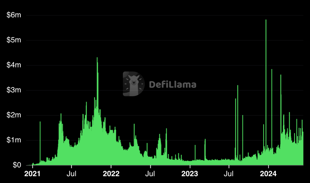 - Since the start of the year, the protocol's daily revenue has risen from about $600K to over $1M, mirroring the TVL uptrend. Total fees collected this year have reached $160M, showcasing consistent growth. This upward trajectory highlights the protocol's strong performance and increasing adoption.