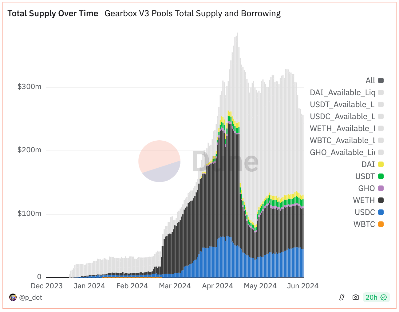 - Increased rates have led to more lending inflows. The incoming supply, though, also gets borrowed at 15%+ APYs by leveraged points farmers. This enables Gearbox to scale with higher rates despite growing size. Creating a positive growth loop & 12Xing supplies.