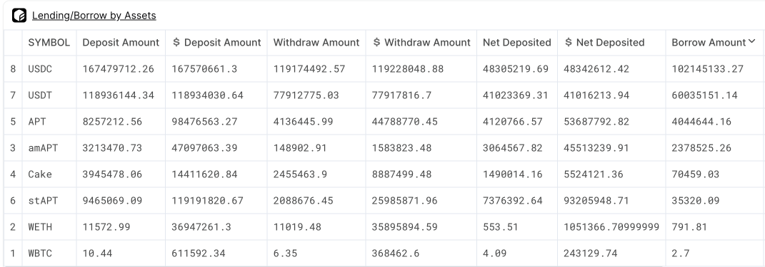 - USDC and USDT are the principal assets borrowed on Aries, with the amount of USDC borrowed reaching $100M. This highlights the prominent role of these stablecoins in the borrowing activities on the platform.
