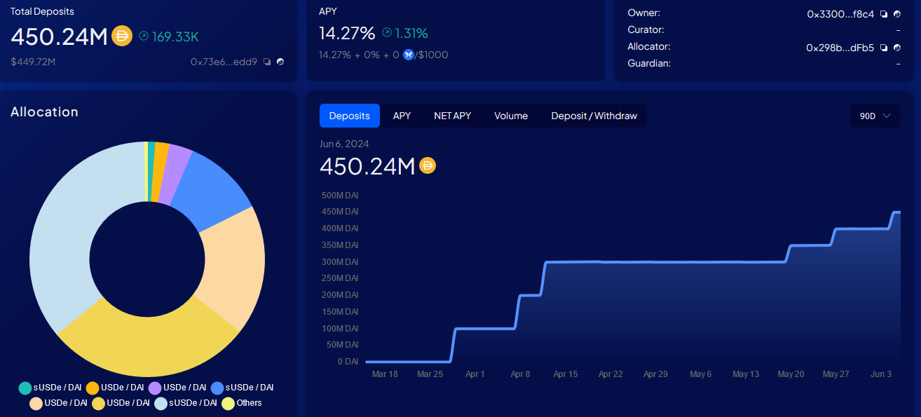 - Following the creation of the Spark DAI Vault on MetaMorpho in March, an increasing interest of DAI has been utilised on Ethena's USDe product, totalling $450.24 million deposits. With currently 99.65% of the vault allocated in sUSDe or USDe vault expanding yield for DAI holders.