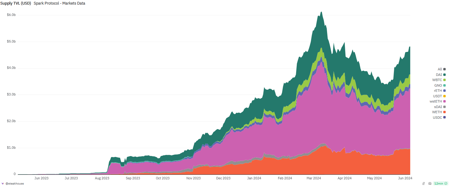 - π¦π¬ Tx-Level Alpha: On June 1, a user made a $116M deposit in the wstETH Spark vault, and borrowed $26M DAI, making it the largest deposit into the protocol to date! This shows the increasing demand from large players to interact with Spark's vaults and leverage DAI.