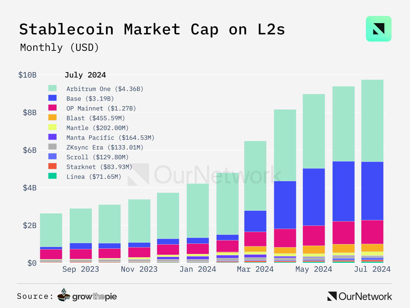 - The stablecoin market cap for Layer 2s has also been rising β it's now approaching $10B. For context, this is equivalent to ~12.5% of stablecoins on Ethereum or ~5.7% of the entire stablecoin market. Over 75% of L2 stablecoins are on Arbitrum One or Base β Arbitrum One, at ~45% among all L2s, has the largest slice.