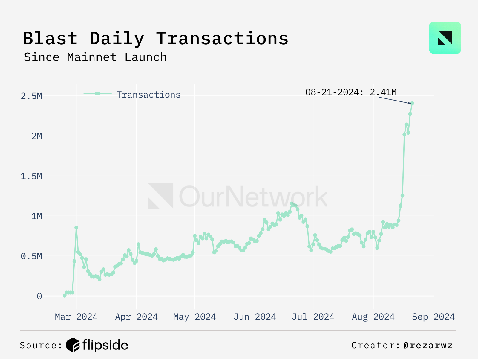 - Blast is the only Ethereum L2 with native yield for ETH (4%) and stablecoins (6%). In less than six months since Blast's launch and under two months after the first airdrop, Blast reached 121.5M transactions on its network, averaging 20M transactions per month. In the past seven days, daily transactions have seen a sharp increase, reaching an all-time high of 2.72M transactions in a single day. Daily transactions in the last 2 weeks have surpassed pre-token generation event (TGE) averages.
