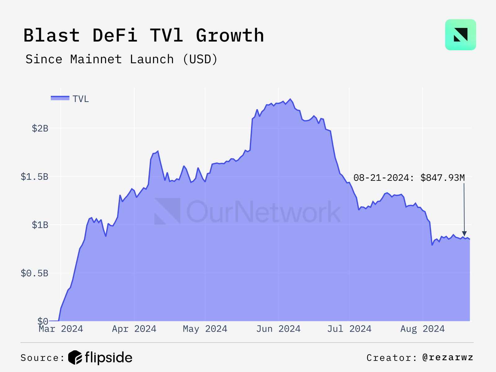 - Blast, well-known for its DeFi ecosystem, reached $1B in TVL within 10 days of its launch, peaking at $2.3B. Post-TGE, its TVL has sharply declined, now down 60% from its ATH, standing at $857M. Over 80% of TVL is from platforms native to Blast, led by Thruster, Juice Finance, and Particle Trade.