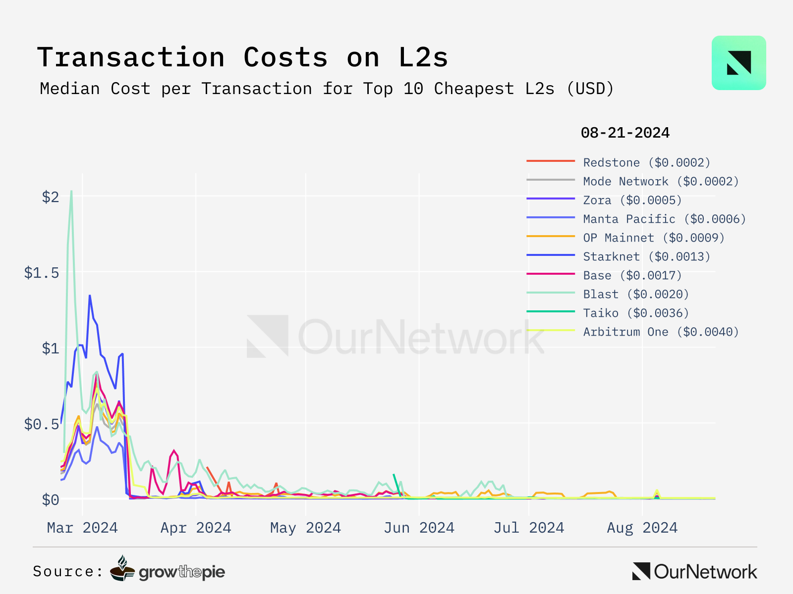 - Sub-cent transaction costs are now the norm for most L2s β out of the 16 chains growthepie tracks all but 2 of them are currently below 1 cent for median transaction cost. These costs are subject to spikes. The highest daily median transaction cost in the past 30 days was for $0.124 on Polygon zkEVM.