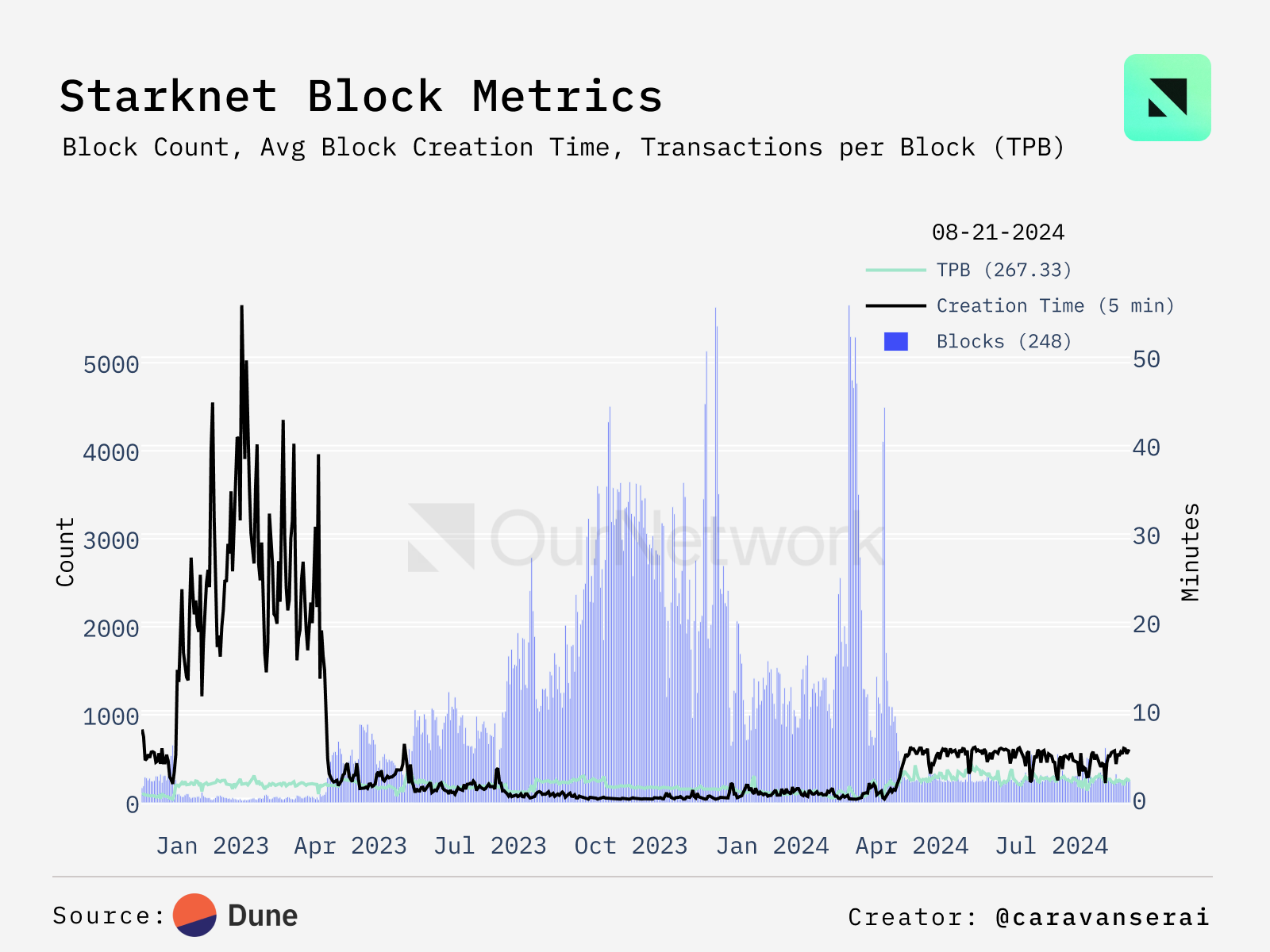 - Starknet is a permissionless zero-knowledge rollup layer 2 for Ethereum that enables computation at scale while leveraging Ethereumβs composability and securty. On average, approximately 300 blocks are created every day, with a creation time of 4 to 6 minutes. With the Starknet v0.13.2 upgrade on the horizon, parallel execution will be added to the network, allowing transactions to be processed simultaneously. This will ultimately increase TPS and decrease block creation time.