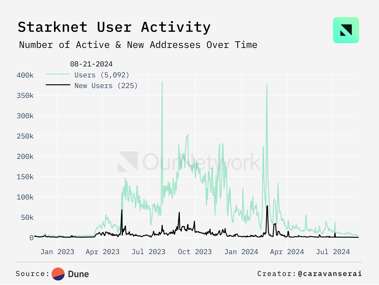 - Starknet's mainnet launched on Nov. 16 2021, with the STRK token deployed a year later. Activity spiked due to airdrop eligibility, but after the STRK launch in February 2024, active and new users declined, averaging fewer than 1,000 new users and 10,000 active users daily.