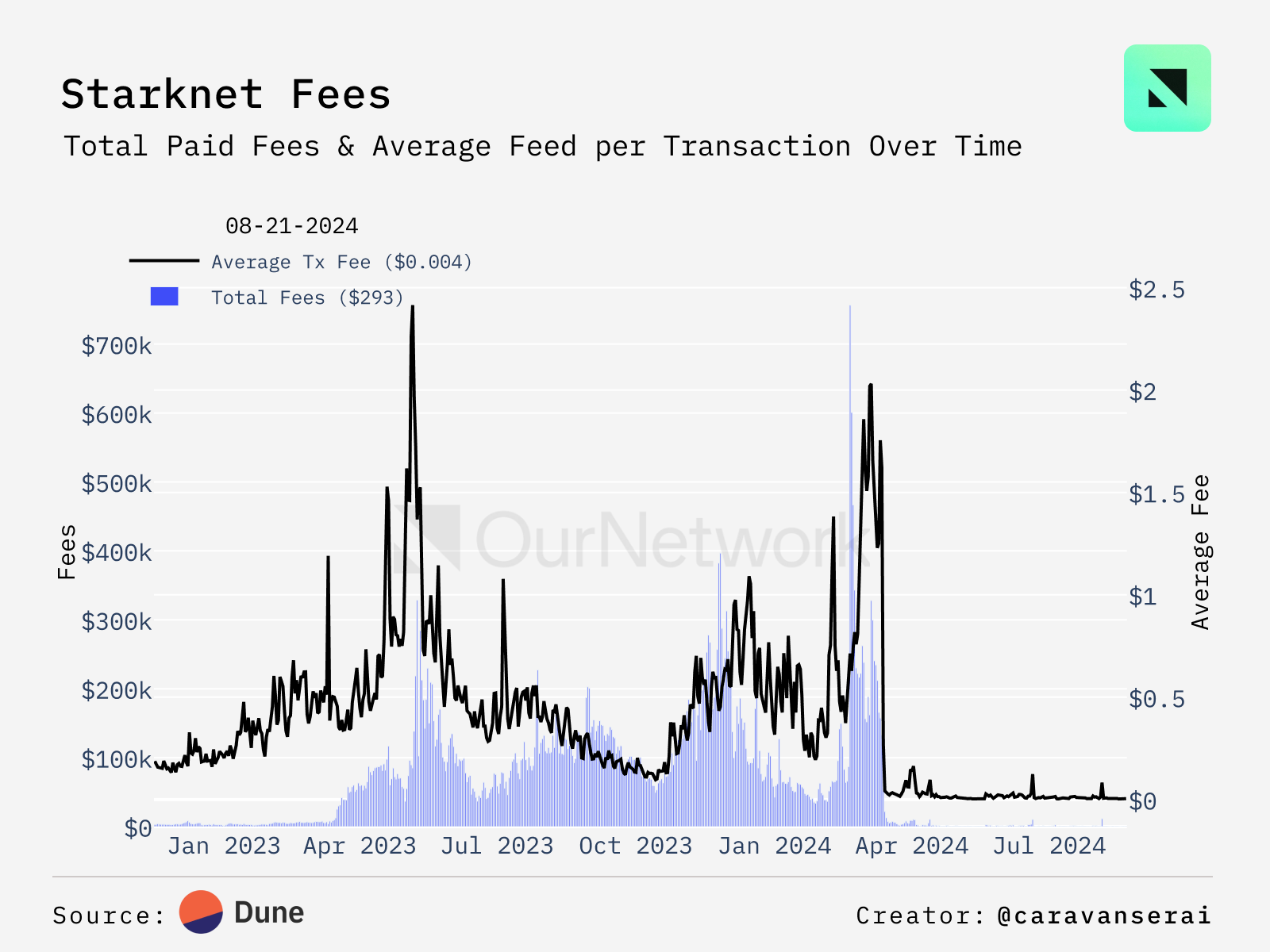 - With Ethereum's Dencun update going live on March 13 and the introduction of blob transactions, transaction fees on major L2s, including Starknet, have significantly decreased. Since then, all of Starknet's transactions have used blobs, with average fees dropping to sub-cent amounts.