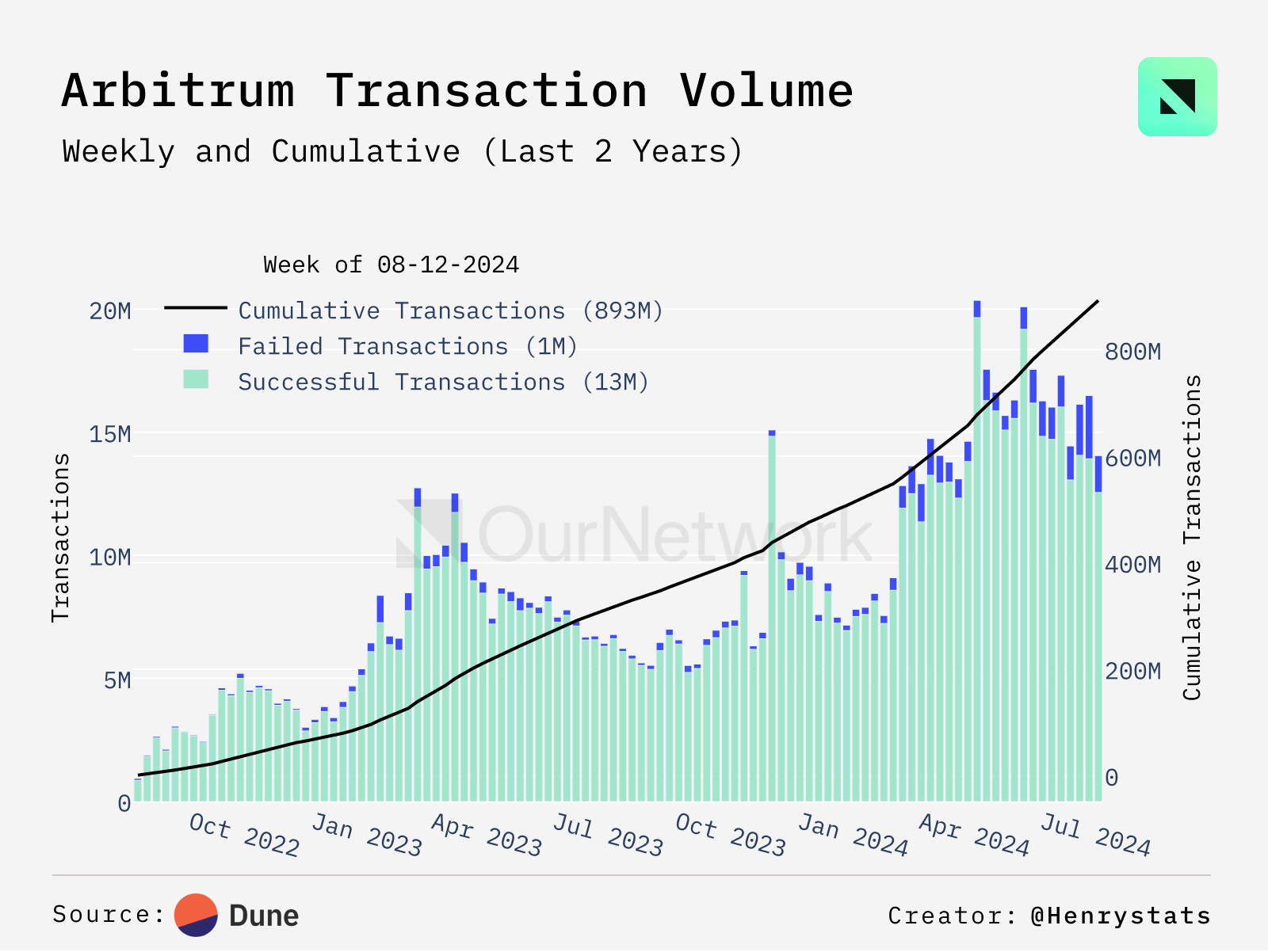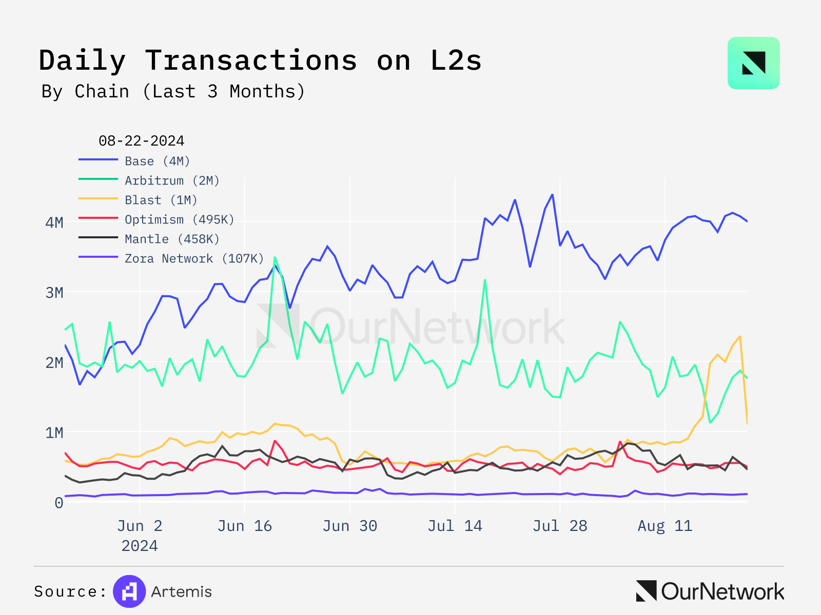 - Coinbase describes Base as a "secure, low-cost, builder-friendly Ethereum L2 built to bring the next billion users onchain." Since the beginning of the year, Base has seen strong growth across numerous metrics including daily active addresses, DEX volumes and transaction count. This past week, Base passed 4M daily transactions, ranking #1 among optimistic rollups.