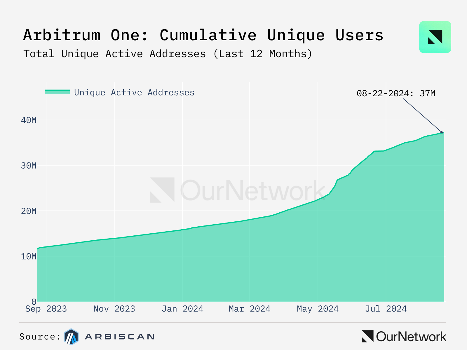 - This chart shows the total distinct numbers of addresses on the Arbitrum One blockchain and the increase in the number of daily active addresses in the past year. The highest increase of 637,812 new addresses happened on May 18, 2024.