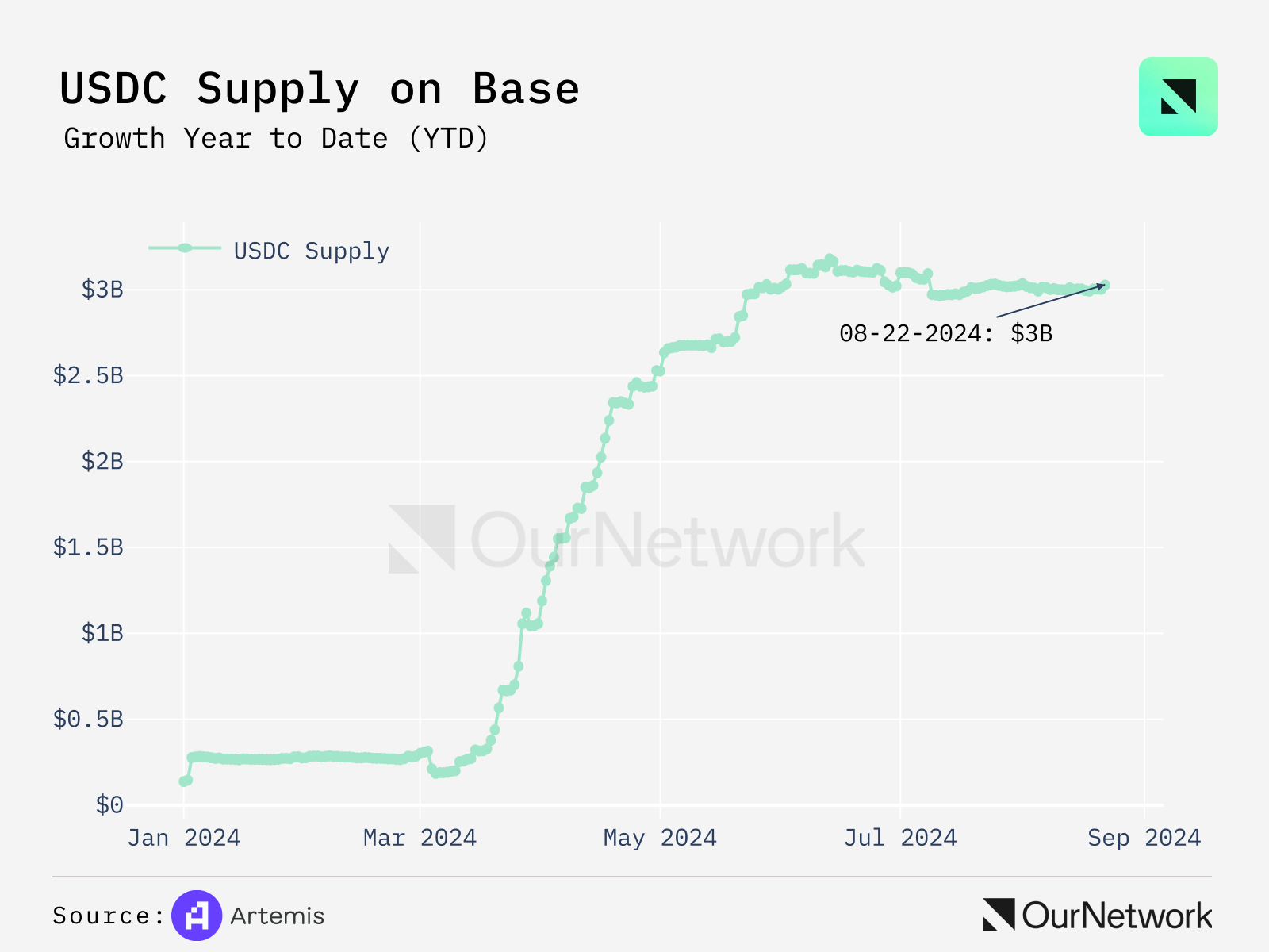 - Given the low fees of optimistic rollups, Base is perfect for stablecoin payments. Circulating supply of USDC on Base has grown at a rapid pace since the start of the year and now hovers around $3B in circulating supply.