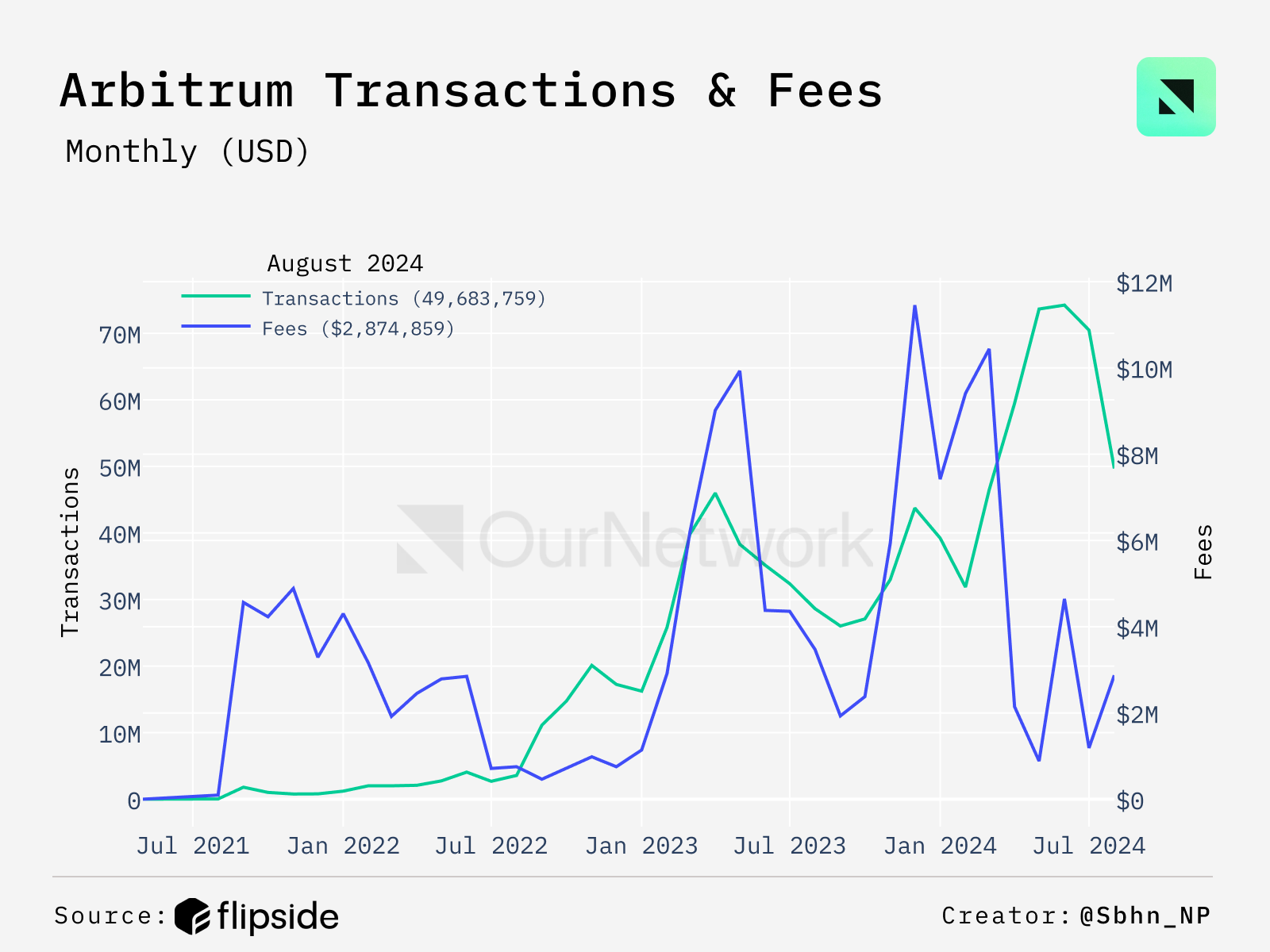 - This chart shows a near doubling in transactions over the past few months, including May, June, and July, while user-paid fees have decreased significantly. Arbitrum successfully managed to lower transaction fees in recent months, achieving more than an 80% decrease in fees after Q1 2024.