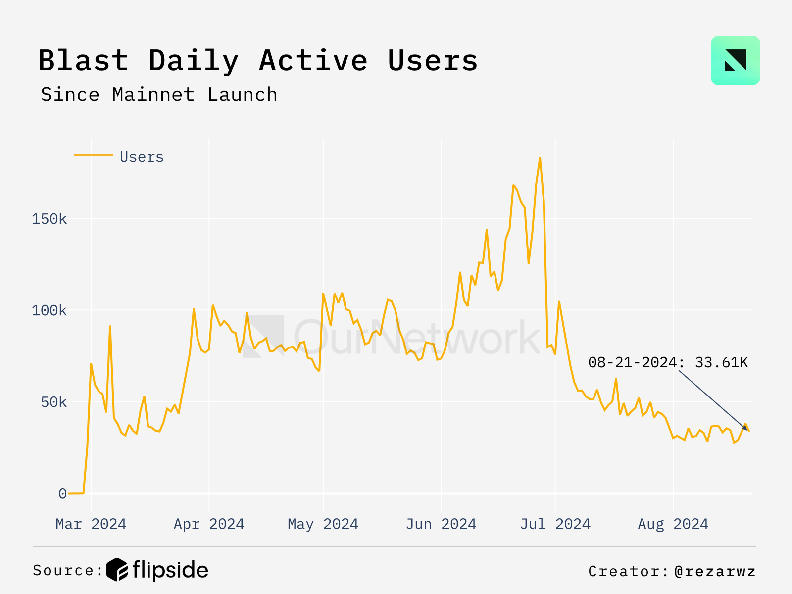 - After TGE, Blast's daily active users experienced a steep decline, dropping from an average of 81K before the TGE to 51K after, a reduction of over 35%. Number of new users also fell sharply, particularly in the last month, averaging 3,000 per day post-TGE, marking a 70% decrease from the 30,000 average.