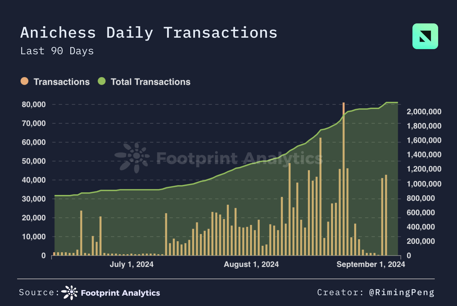 - Anichess, a chess-based strategy game blending traditional gameplay with magical elements, has 283.8k total users with cyclical growth patterns. The platform had a 700% increase in weekly active wallets, reaching over 120K in Q3 2024 with a 5.6% new user rate and a 3.2% daily active user ratio. This was, alongside transaction spikes of 5-8x above baseline. This volatility, coupled with a 28-fold increase in daily trading volume from $50 to $1.4K, suggests a game design that drives intense periodic engagement.