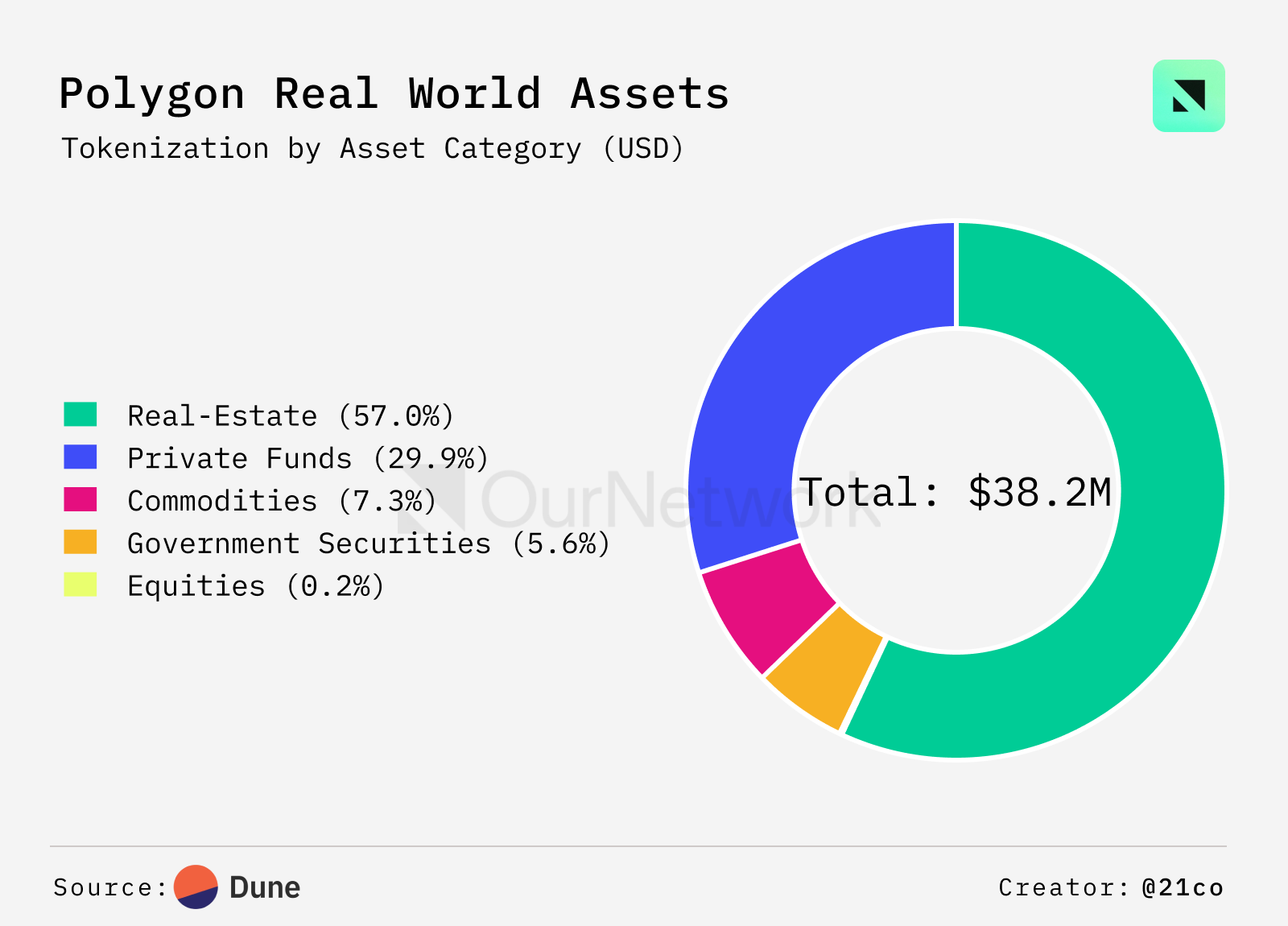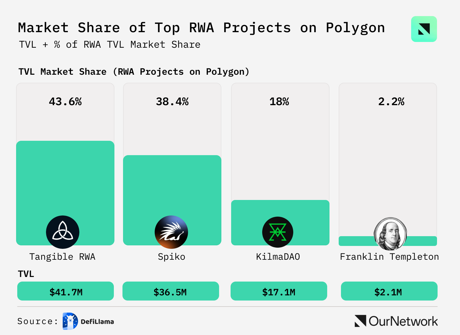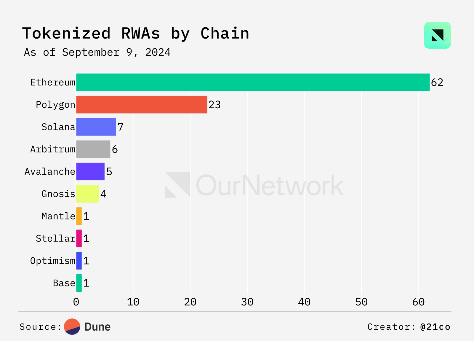 - Polygon has established itself as the second-largest blockchain for tokenized RWAs, with its 23 assets trailing only Ethereum's 62. This positions Polygon as a significant player in the space — the platform’s RWAs have a total market capitalization of $531.58M.