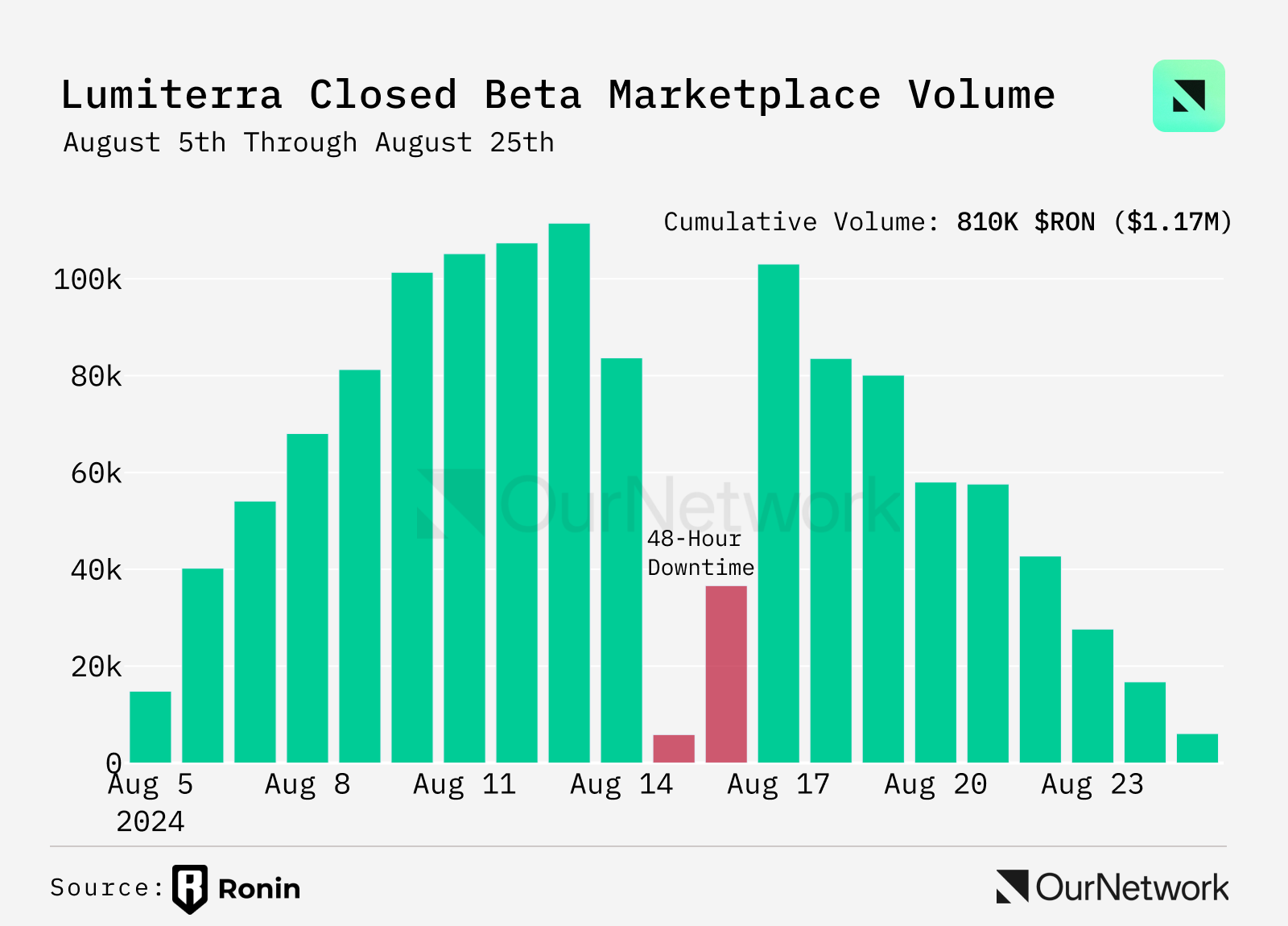 - Lumiterra, a multiplayer, open-world survival crafting game, had a 20-Day Closed Beta which generated 810K $RON in Marketplace Volume from items crucial to player progression. Lumiterra is the latest testament to the Ronin Effect - Ronin’s curation and amplification of high quality games to the community is a proven formula to drive massive growth.