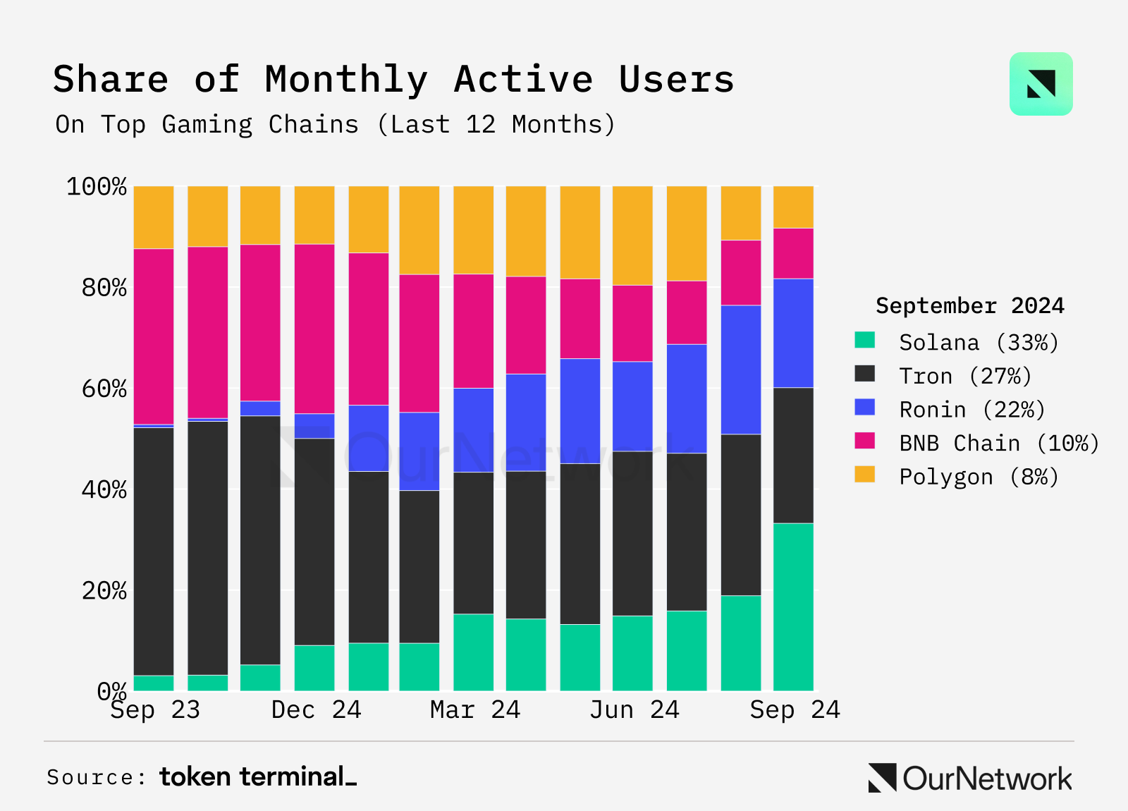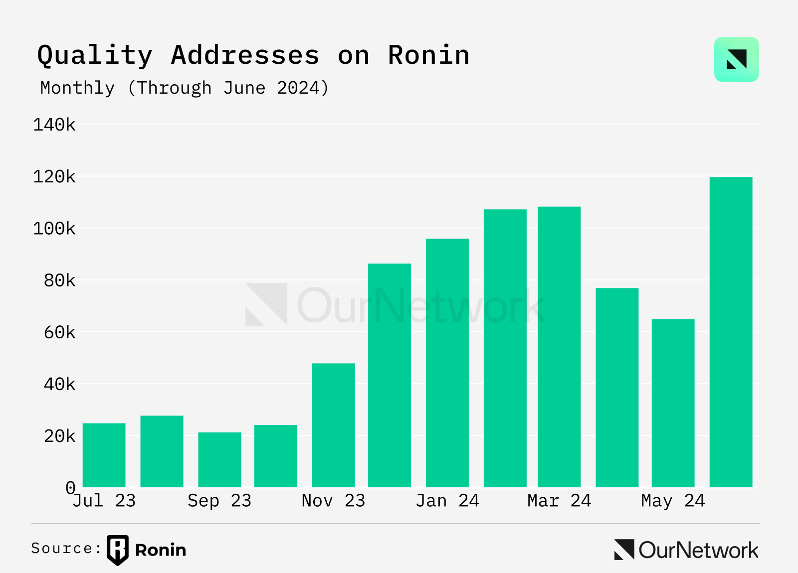 - Ronin (an EVM-compatible L1 focused on supporting the gaming sector) is using the Polygon CDK to build a zkEVM L2 that will connect to the AggLayer which you can explore more on here. Ronin is the dedicated gaming blockchain, designed to be the best place to build, grow, and monetize web3 games. Consistently Top 5 DAU in the Layer 1 category, percentage share has grown from 0.6% to 22% due to creative designs for onchain mechanisms like daily check-ins for reward boosts. Ronin is focused on quality addresses that spend onchain. While we have seen 2-3x growth since 2023, offchain spending is not captured — Pixels has reported >100k active VIPs who spend $10 per month.