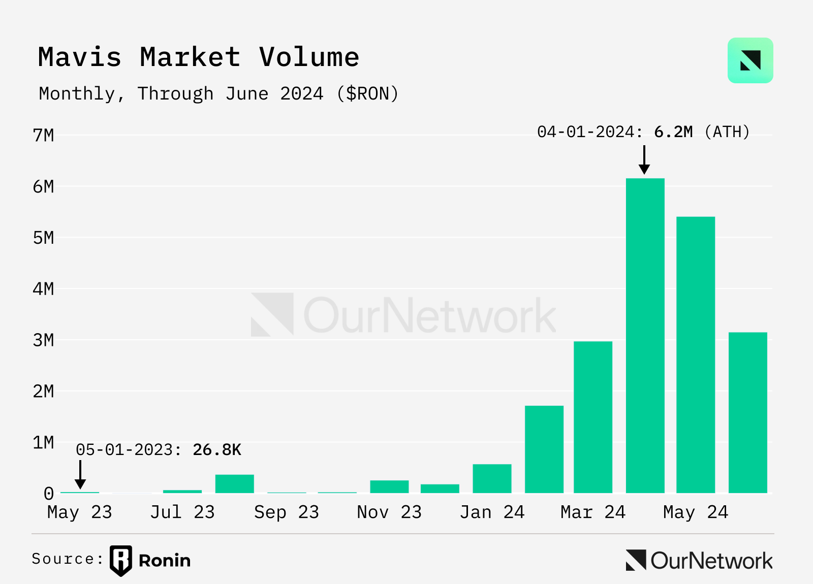 - Mavis Market is the premier NFT marketplace on Ronin that facilitates primary sales and secondary peer-to-peer trading. Mavis Market has grown 16x, with peak monthly volume from $368k in 2023 to $6.15M in 2024. The NFT Launchpad has seen 5 near-instant sellouts with over 3M $RON raised.