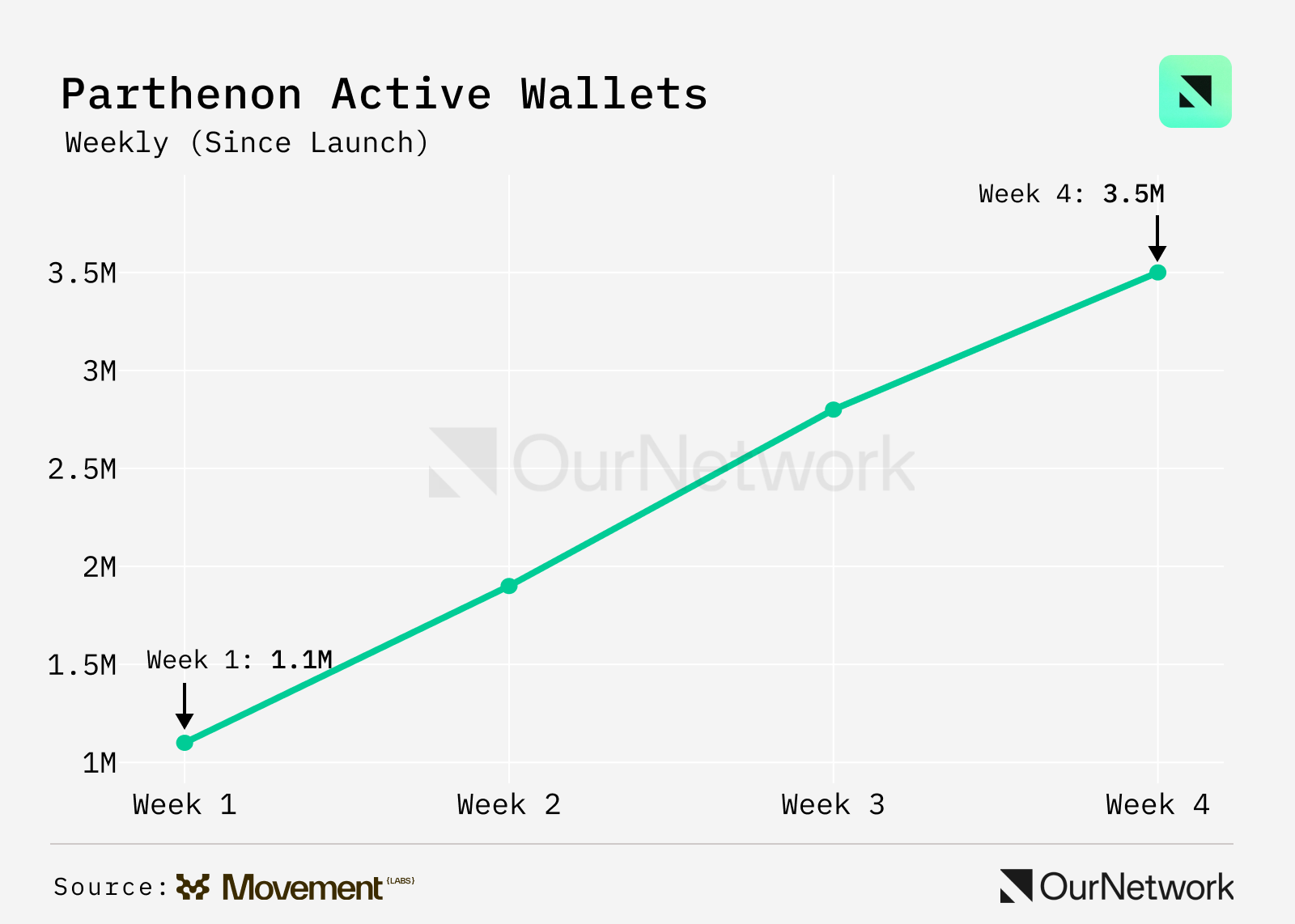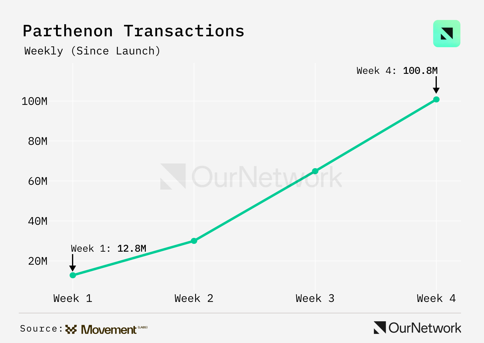 - Within four weeks of Parthenon, Movement Labs’ incentivized testnet program, the network processed over 100M transactions and grown to 3.5M wallets. This demonstrates scalability as well as the effective community engagement.