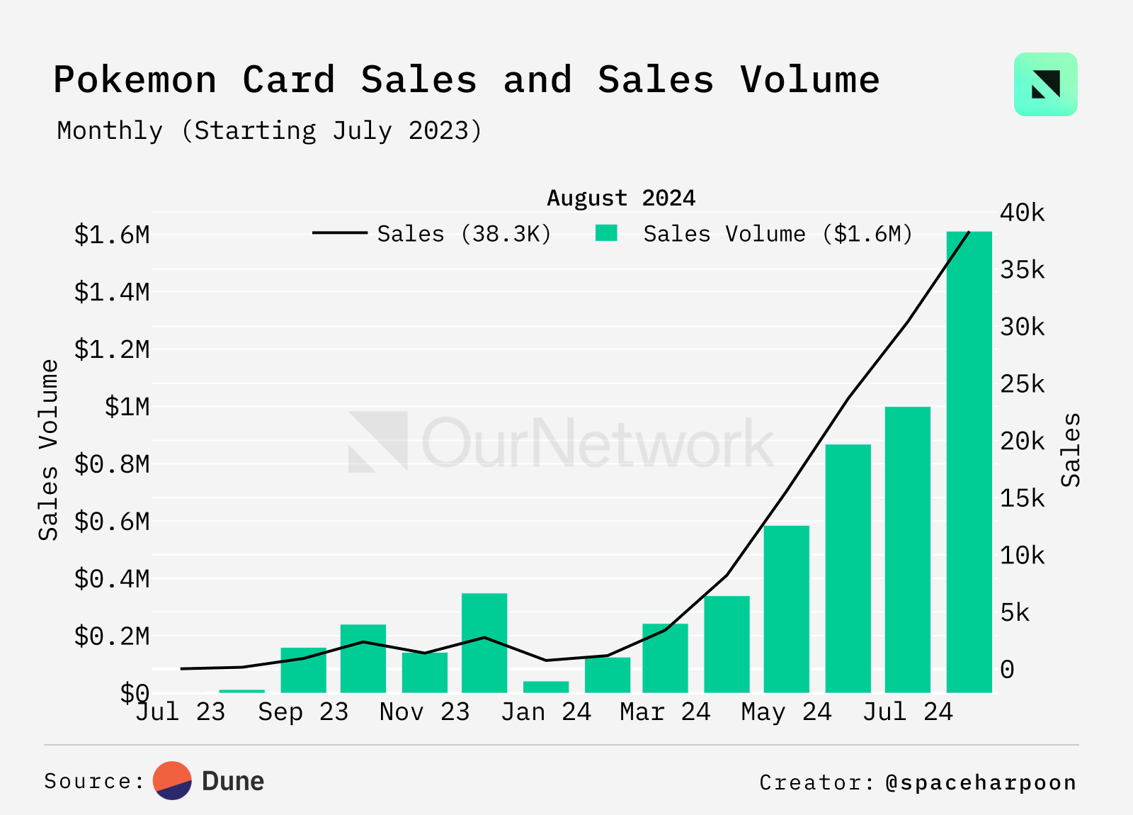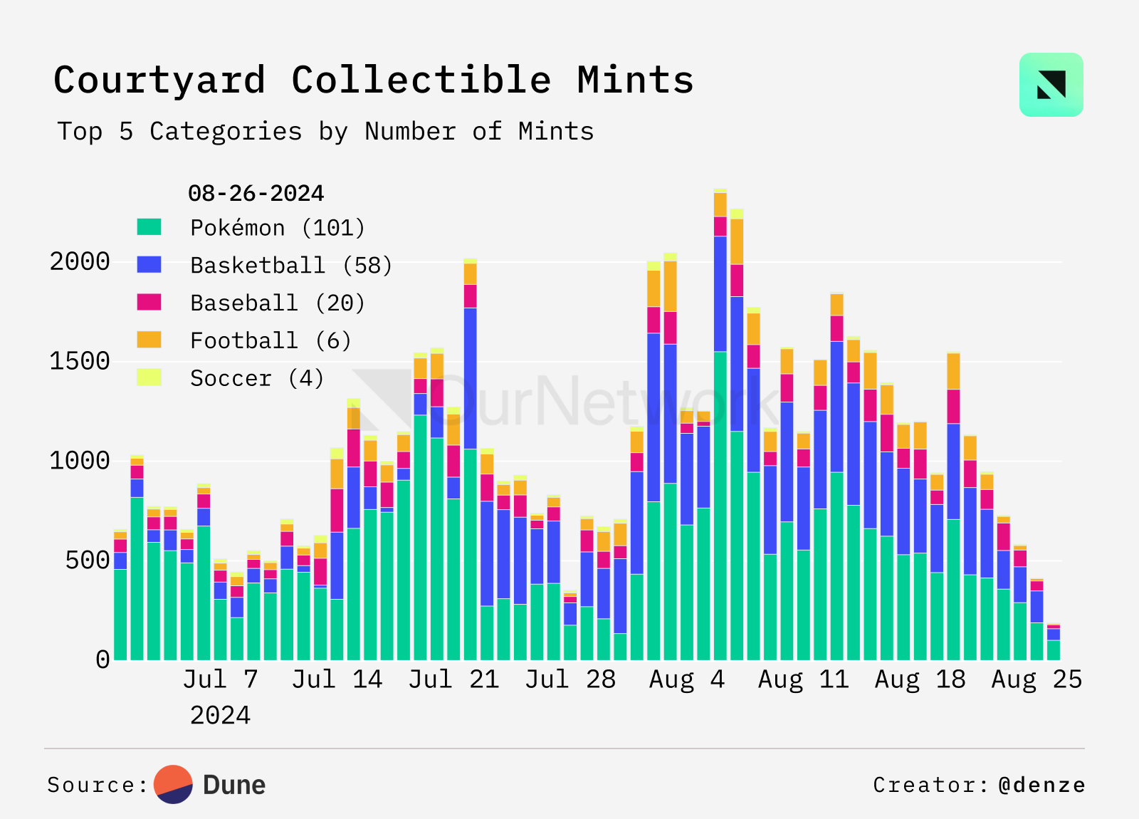 - Courtyard is an onchain collectible trading platform. Daily transactions surged to over 3,000 by mid-2024, with a peak of 9,509 on Aug. 7. This exponential growth can be found from December 2023 onwards, with minted NFTs increasing from about 2.7K monthly to over 30K by July. Pokémon cards dominate trading as August alone 33K sales worth $1.6M happened in August alone, bringing the cumulative Pokémon card sales to over $6.1M.