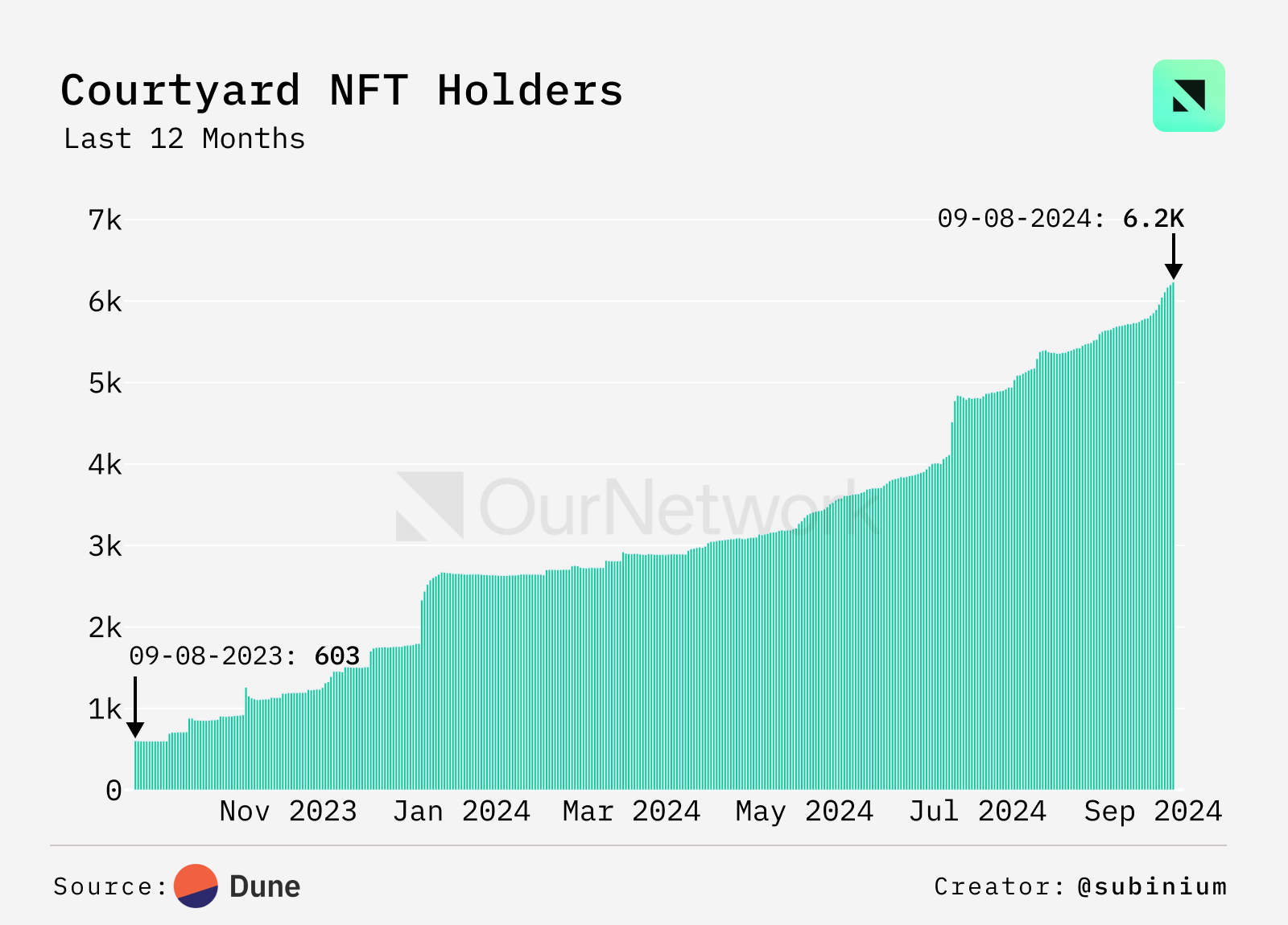 - Courtyard's cumulative user base is now over 6,200. More notably, the platform has attracted 14,601 unique minters (originators) as of the latest data. This substantial growth in both overall users and content creators demonstrates Courtyard's strong appeal to both collectors and artists.