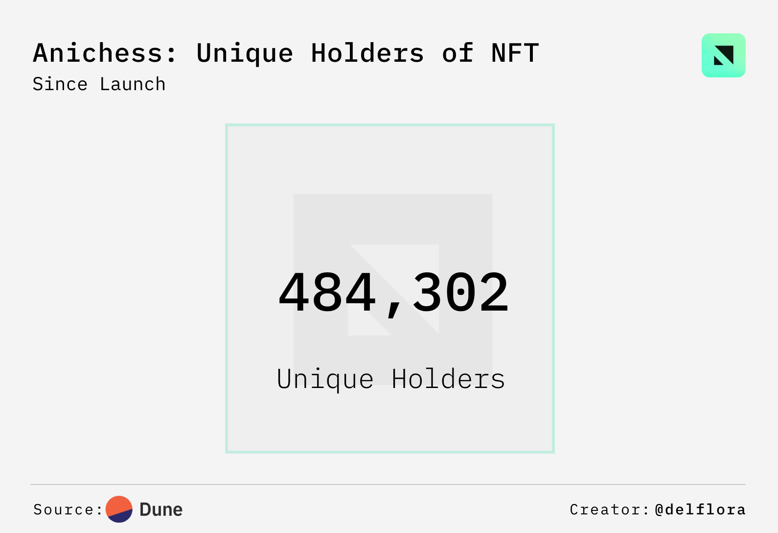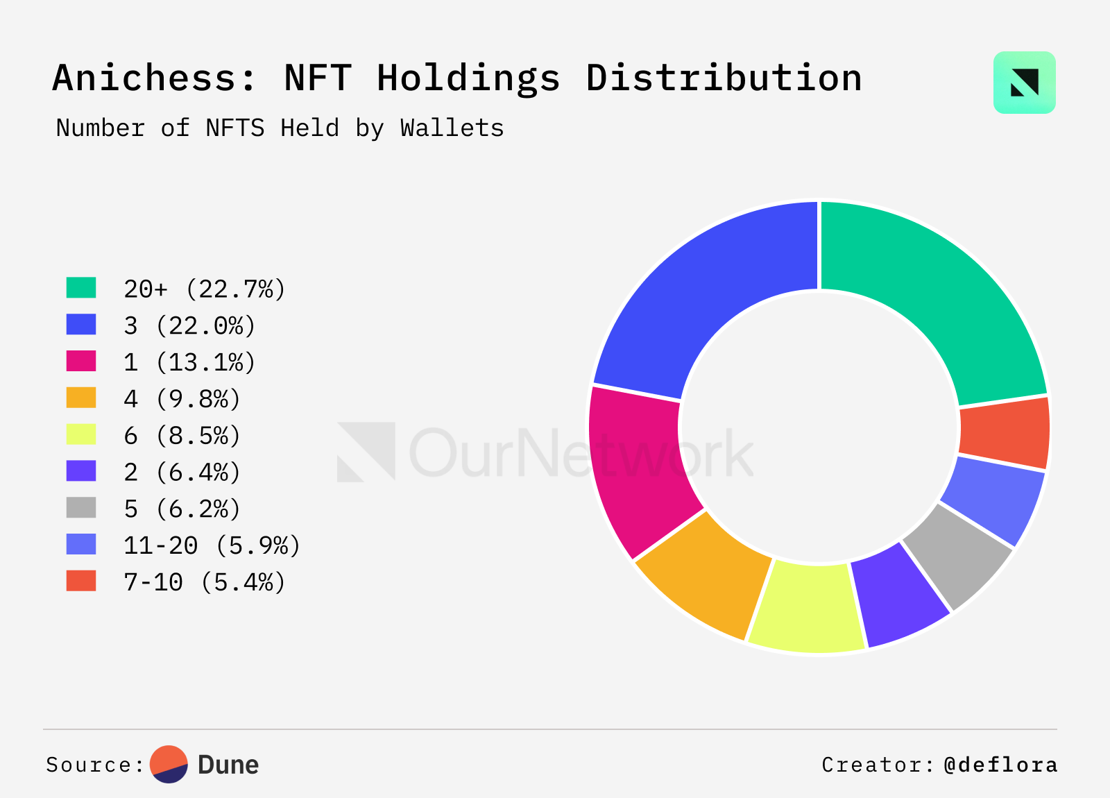 - Anichess shows a diverse user base with high engagement: Out of 484K unique holders, 22.7% of wallets hold either 20+ NFTs, 5.9% of wallets hold 11 through 20, and 5.4% hold 7 through 10. Interestingly, 22% of holders own exactly 3 Anichess NFTs. This distribution indicates power users and newcomers, with periodic catalysts driving mass participation.