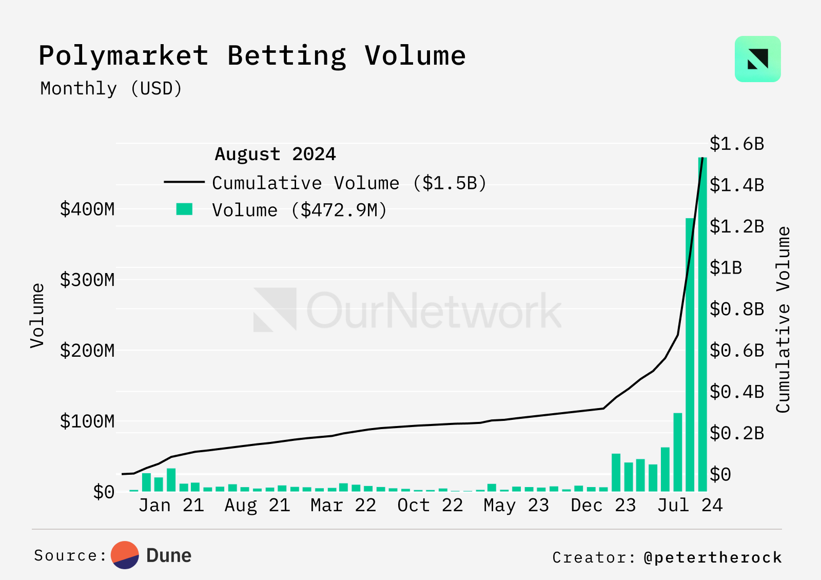 - Polymarket is a decentralized betting platform on Polygon for real-world events. Polymarket's trading volume catapulted to $859M in July and August, a 44x leap from pre-2024 averages. As political tensions simmer and crypto milestones loom, users are flocking to venue for betting — Polymarket's TVL in August shattered the $100M ceiling, climbing to $103.9M by Aug. 22. That's a $32M surge in just 12 days. Polymarket's TVL makes up 83% of the overall prediction markets TVL.