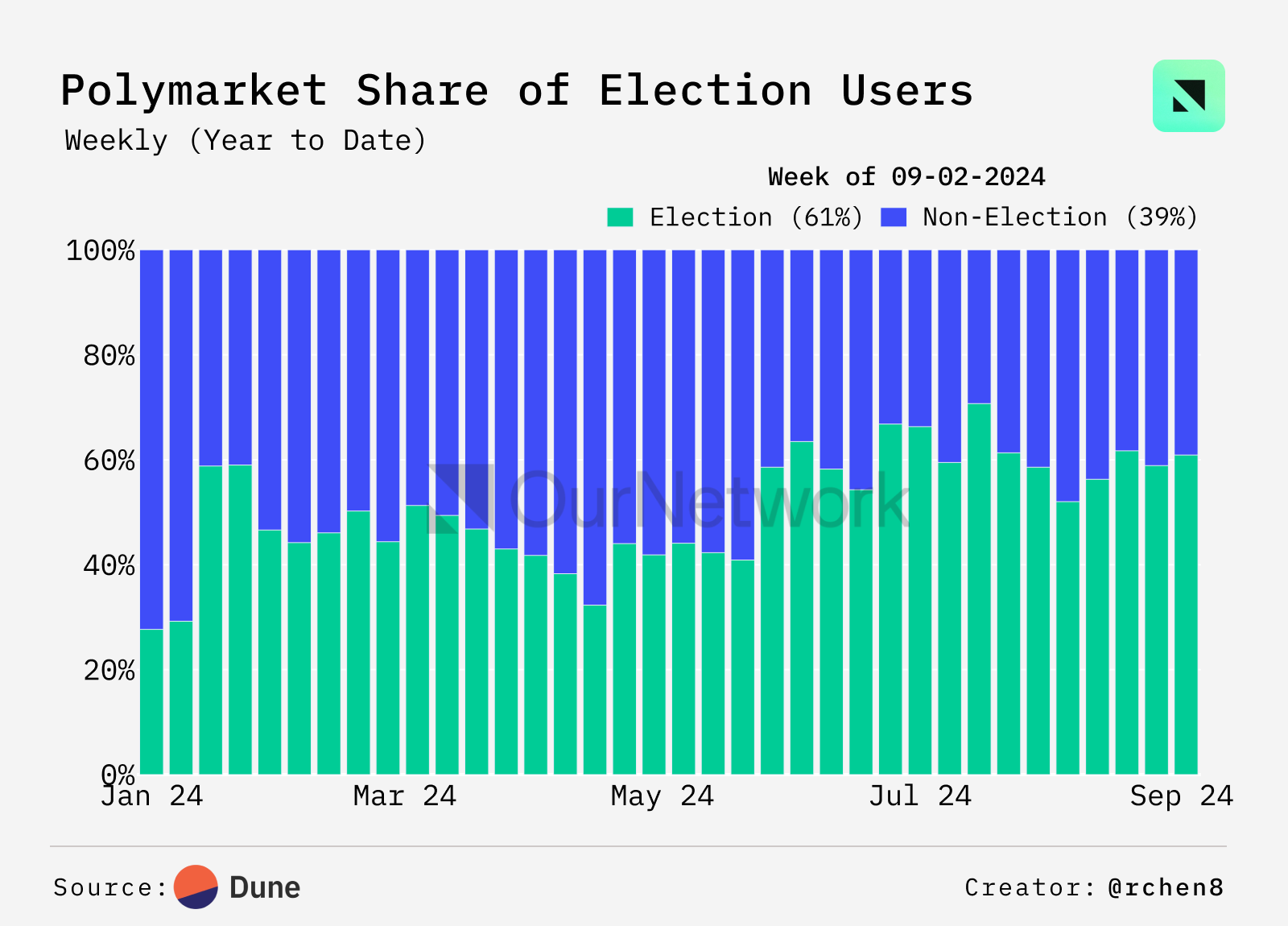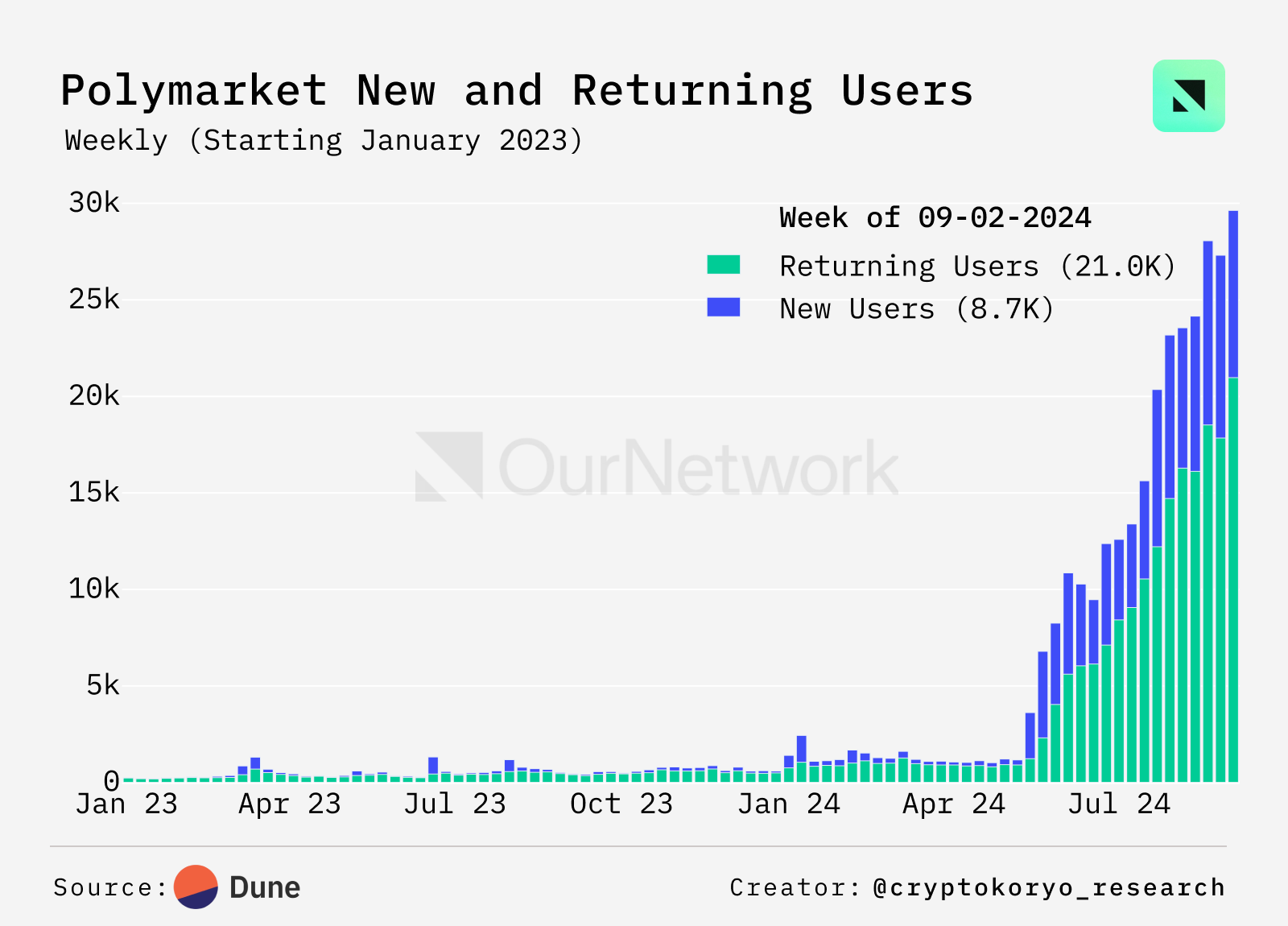 - Polymarket's user base has grown exponentially in 2024. New user acquisition surged from 646 in the first week of January to 5,200 in mid-August. The total user base expanded from 42,445 to 128,393 in just over 7 months — a 202% increase. While the most popular, Polymarket is only one of many emerging prediction markets running on Polygon PoS.
