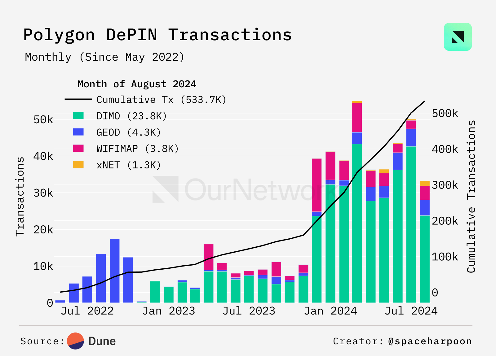 📈 Polygon Infrastructure Hosts 22 DePIN Projects, Fox (over 600k content pieces) and Immutable zkEVM (over 74M transactions)