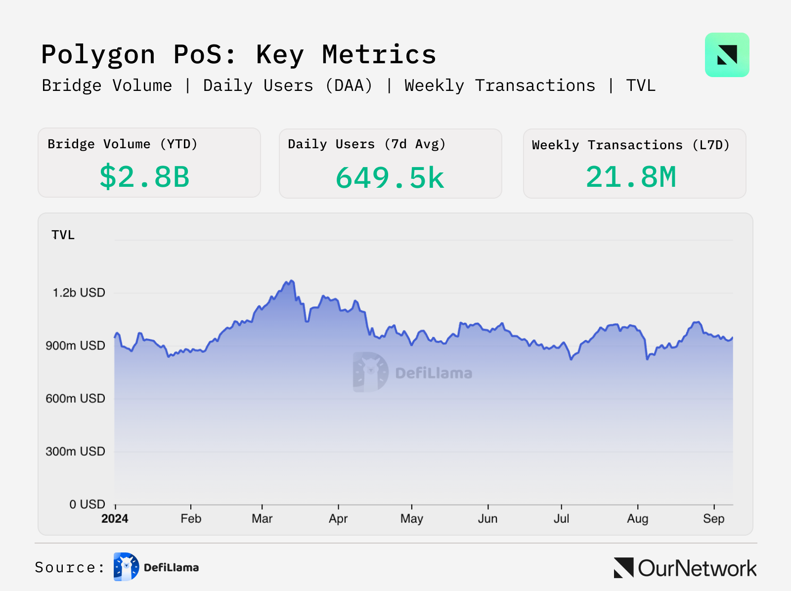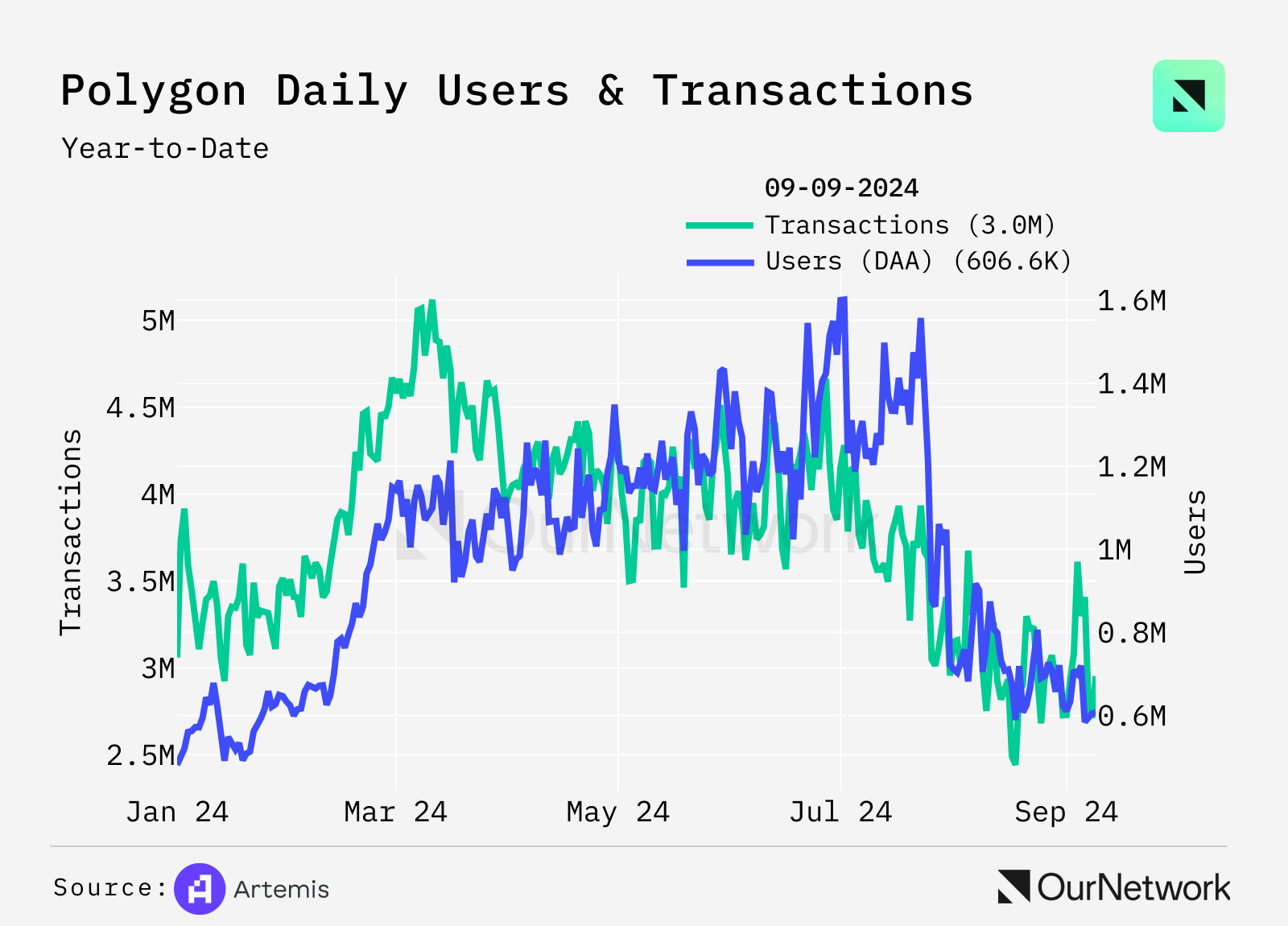 - Polygon is averaging 660k Daily Active Addresses (DAAs) and 3M Daily Transactions over the 1st 10 days of September. On Sept. 4, the MATIC ➡ POL migration took place — users upgraded over 66% of MATIC into POL within 6 days. In place of MATIC, POL introduces the concept of a 'hyperproductive token', where it can be used to provide valuable services to any chain in the Polygon network, including the AggLayer itself.