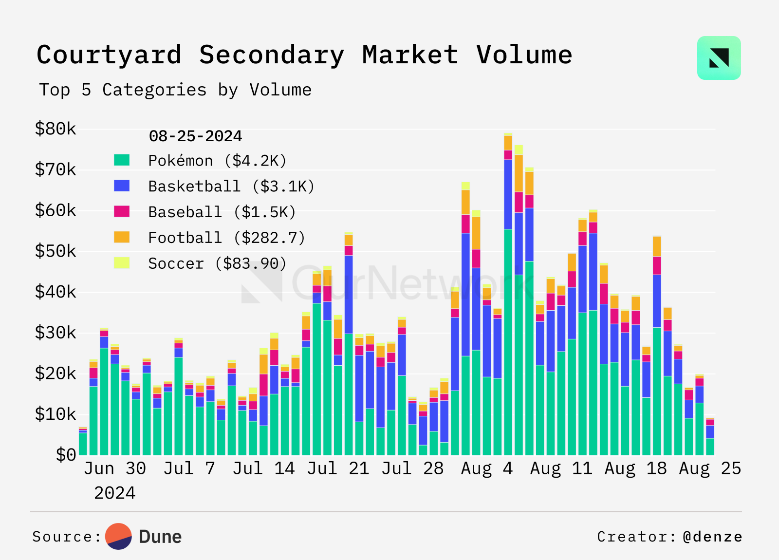 - With Pokémon accounting for 71% of traded assets, the collectible “pocket monsters” dominate Courtyard's market. While Pokémon cards lead, the platform offers basketball collectibles along with other sports. Secondary market activity has reached up to $80,000 on peak days, suggesting increasing liquidity.
