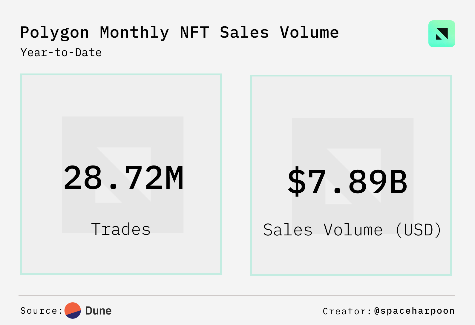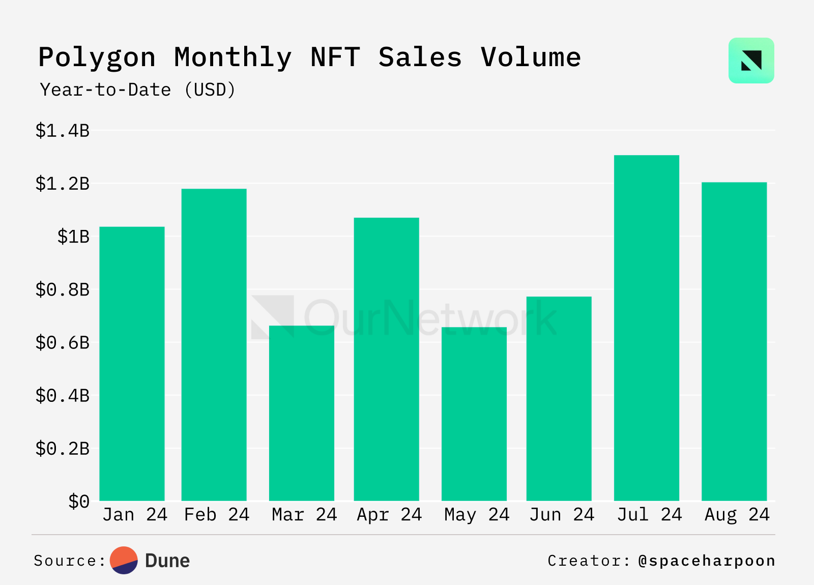 - Polygon has facilitated over $7.8B of NFT sales volume through 28M trades. At $1.3B and $1.2B in July and August, their last two months worth of NFT sales volume were also at all-time high for the year 2024.