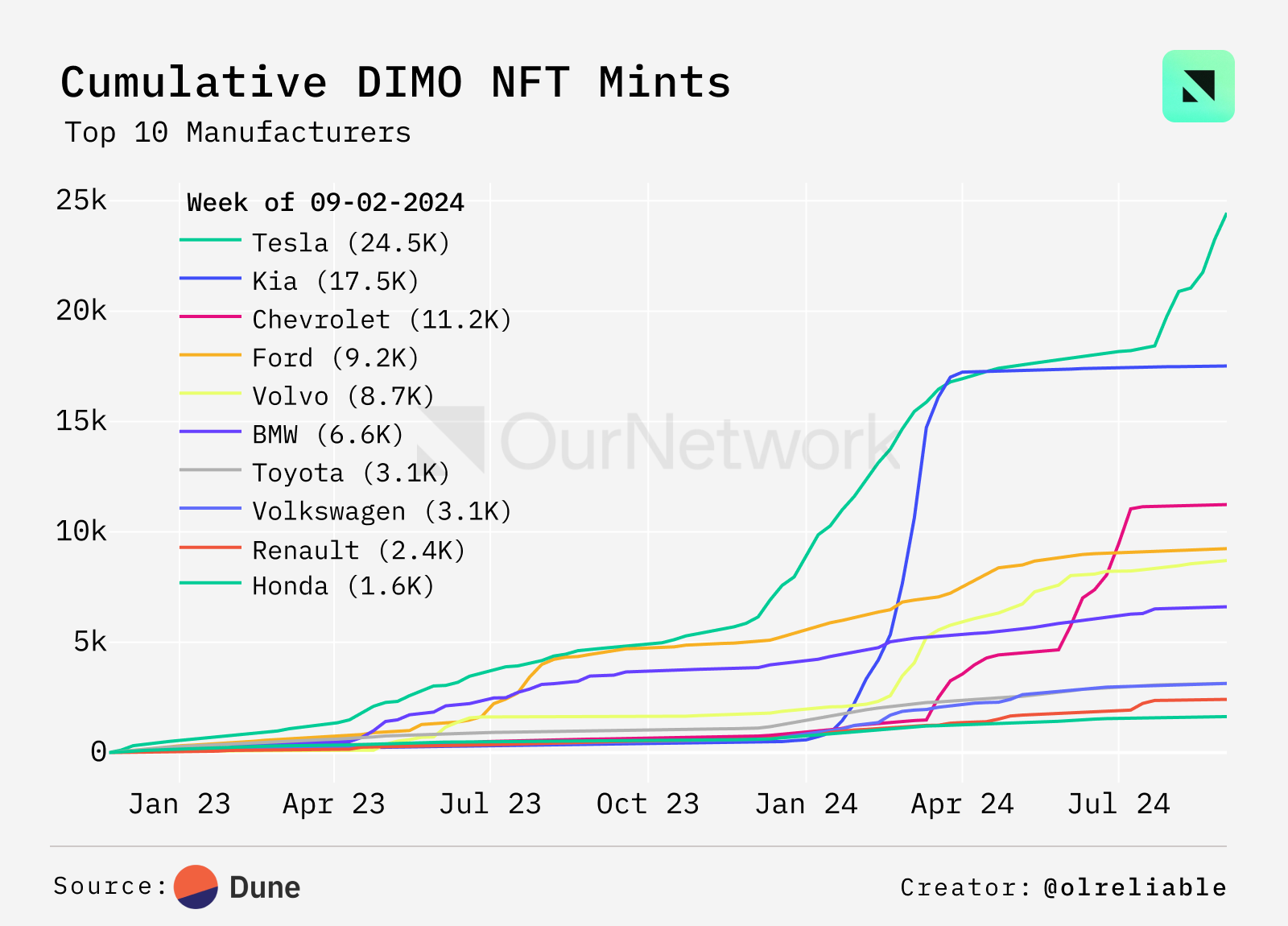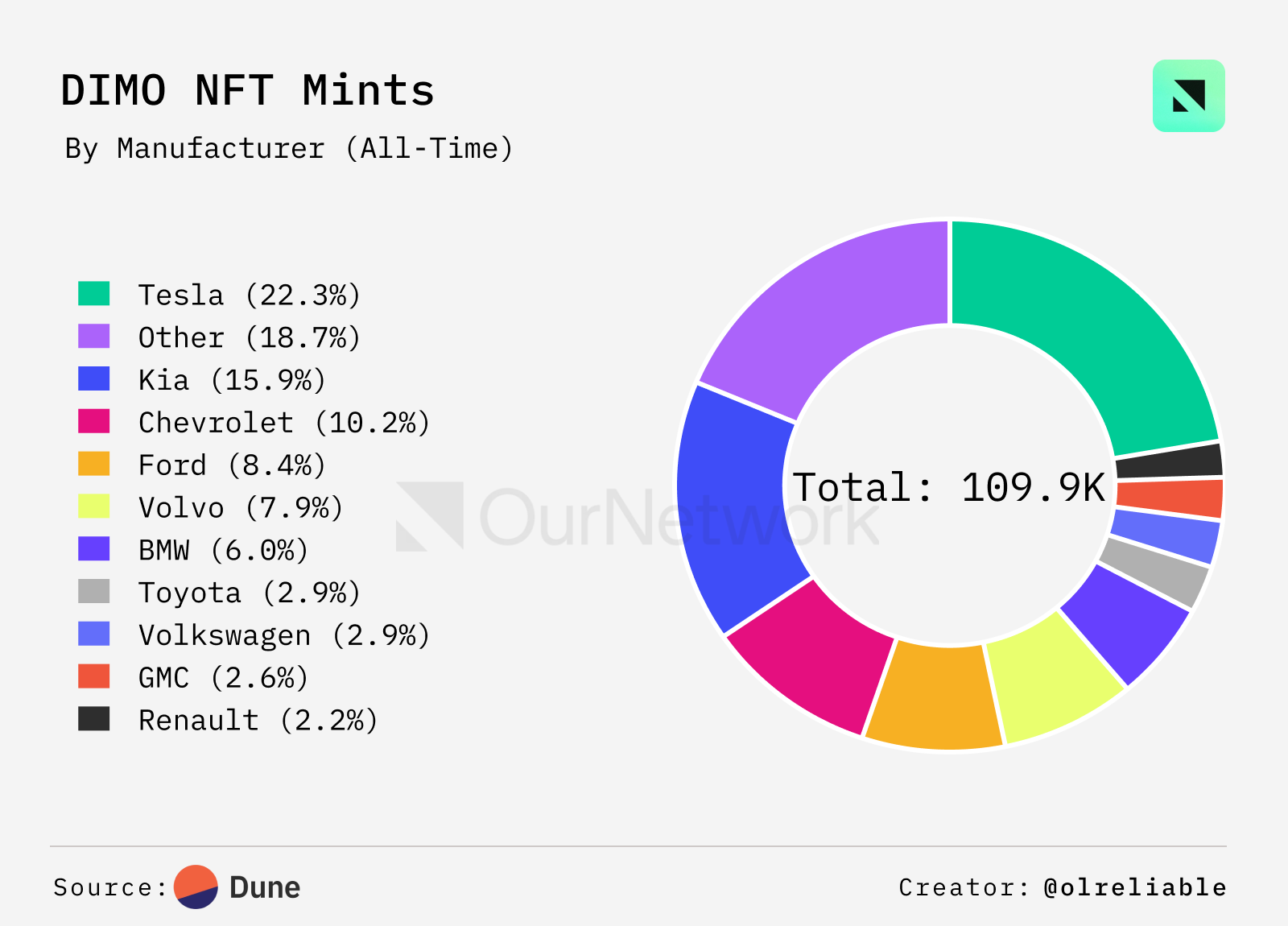 - DIMO, an open connected vehicle platform leveraging data for driver benefits, has attracted over 20 vehicle brands. Tesla leads with a 20.2% market share, having recently enabled direct integration as the first automaker to officially support DIMO. Following Tesla are Kia (15.6%), Chevrolet (10.0%), and Ford (9.7%). This broad appeal across automotive segments underscores DIMO's potential for widespread adoption and valuable cross-brand data aggregation.